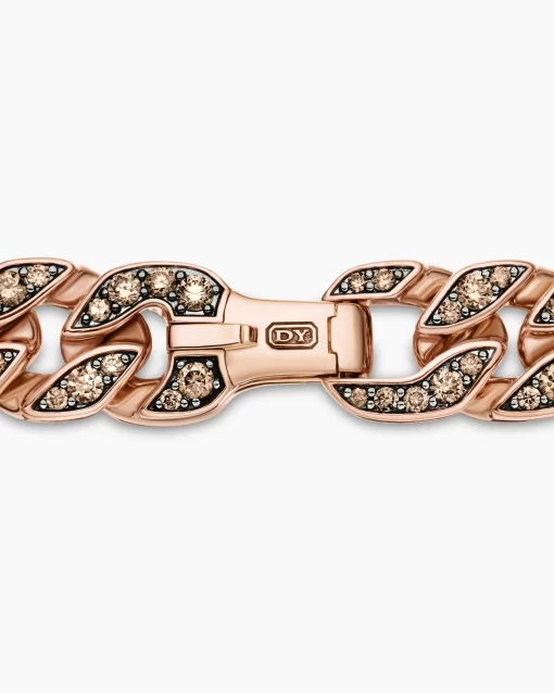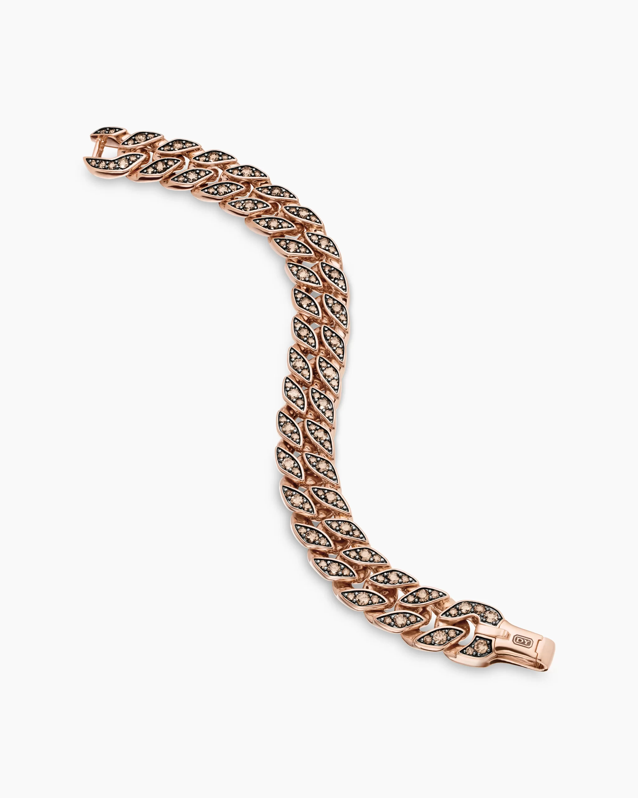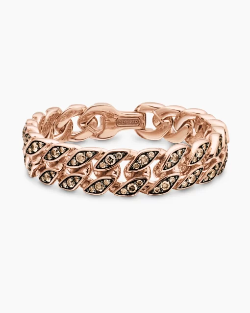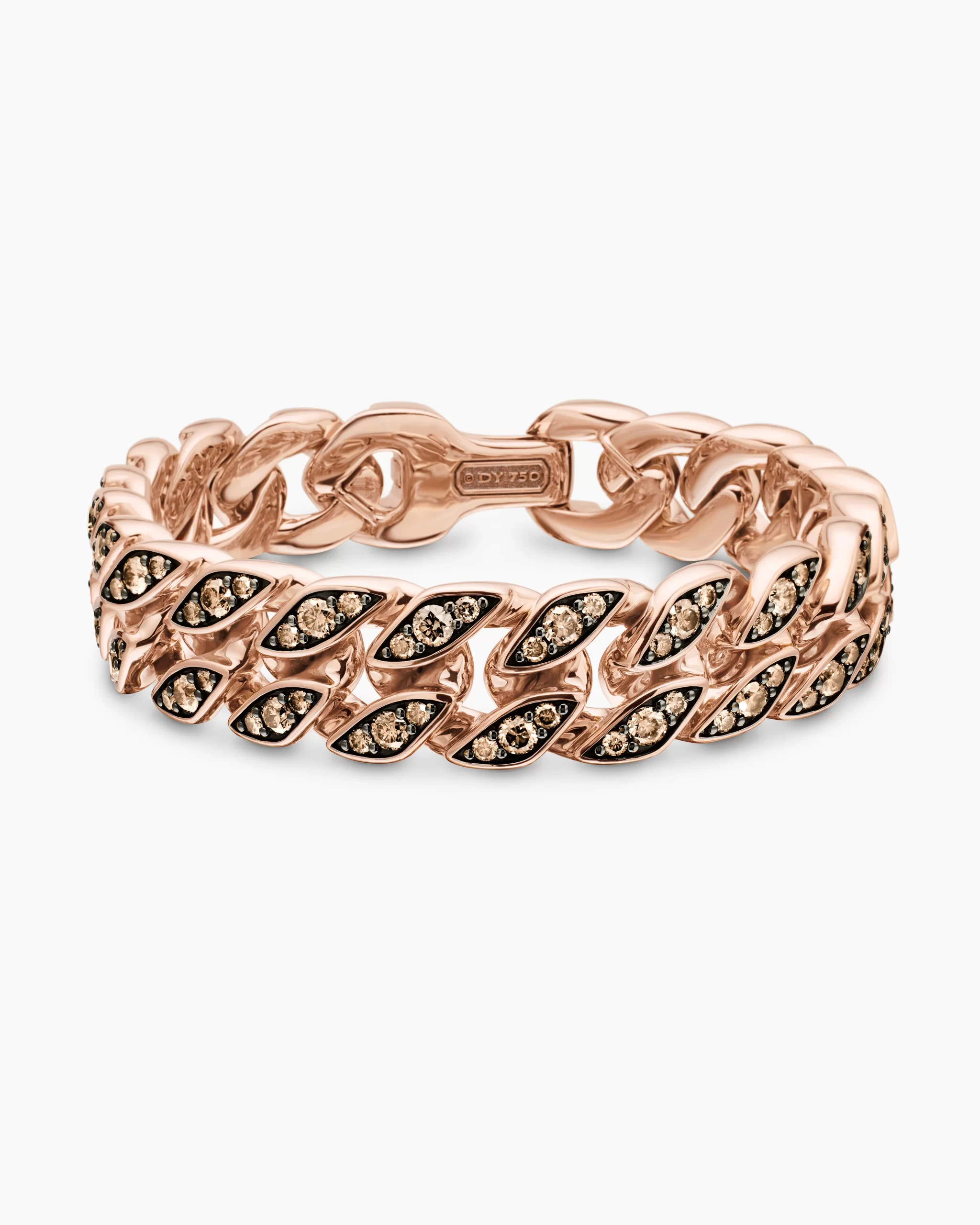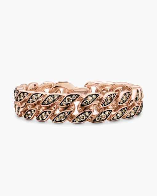 Inspired by David’s passion for horses, Curb Chain is the most elevated expression of our signature chain links. Its timeless elegance is rooted in the traditional equestrian bridle tack used to create control and stability during moments of speed. Forged precious metal is carved into Cable-like S-curves, each link crafted with impactful precision and hand-assembled with the next, culminating in a striking chain engineered for effortless movement.18-karat rose goldPavé-set cognac diamonds, 9.16 total carat weightBracelet, 14.5mmPush claspSize medium fits wrists up to 7.25in