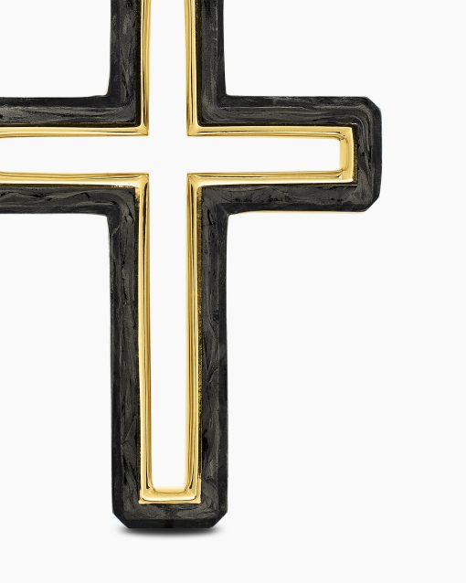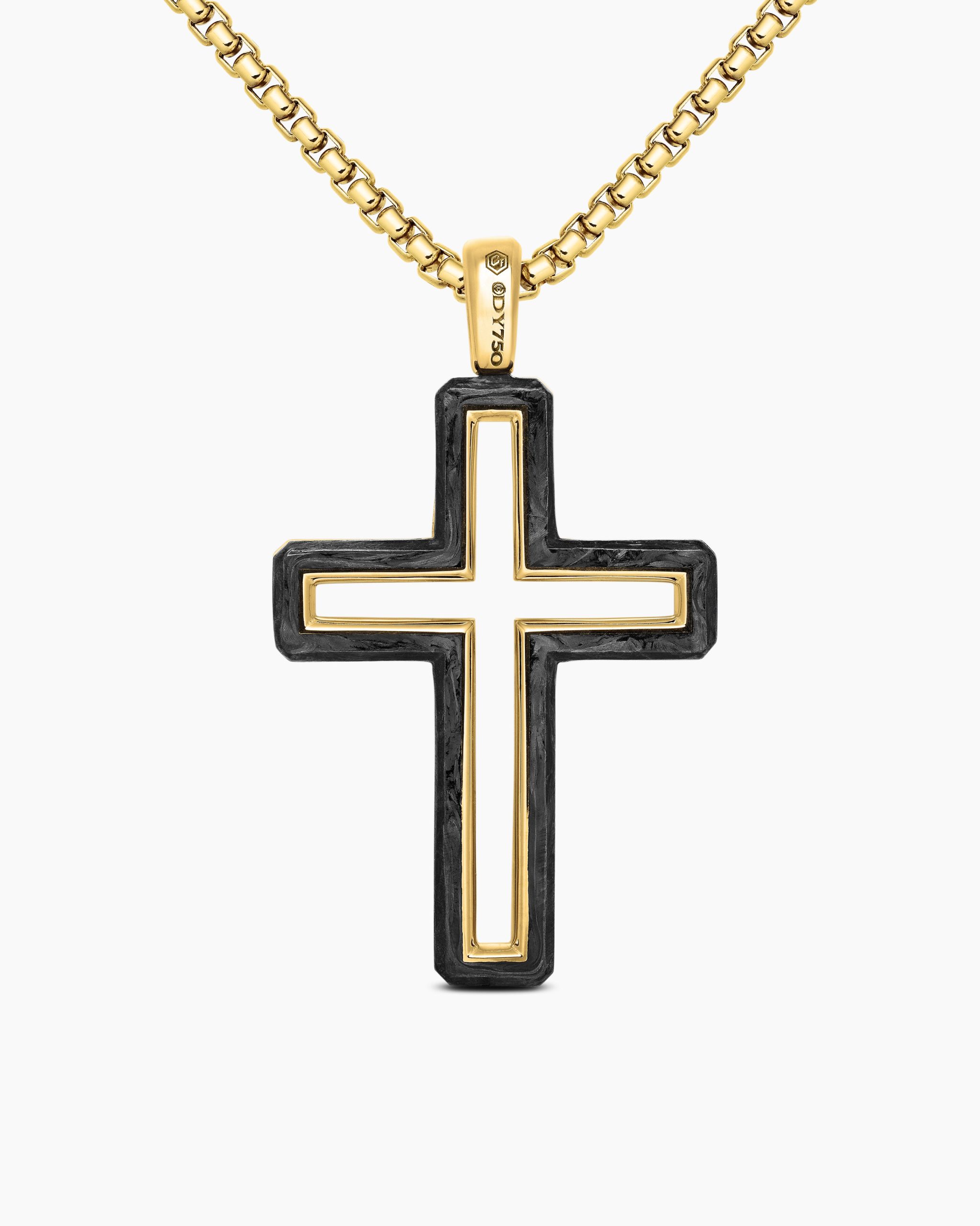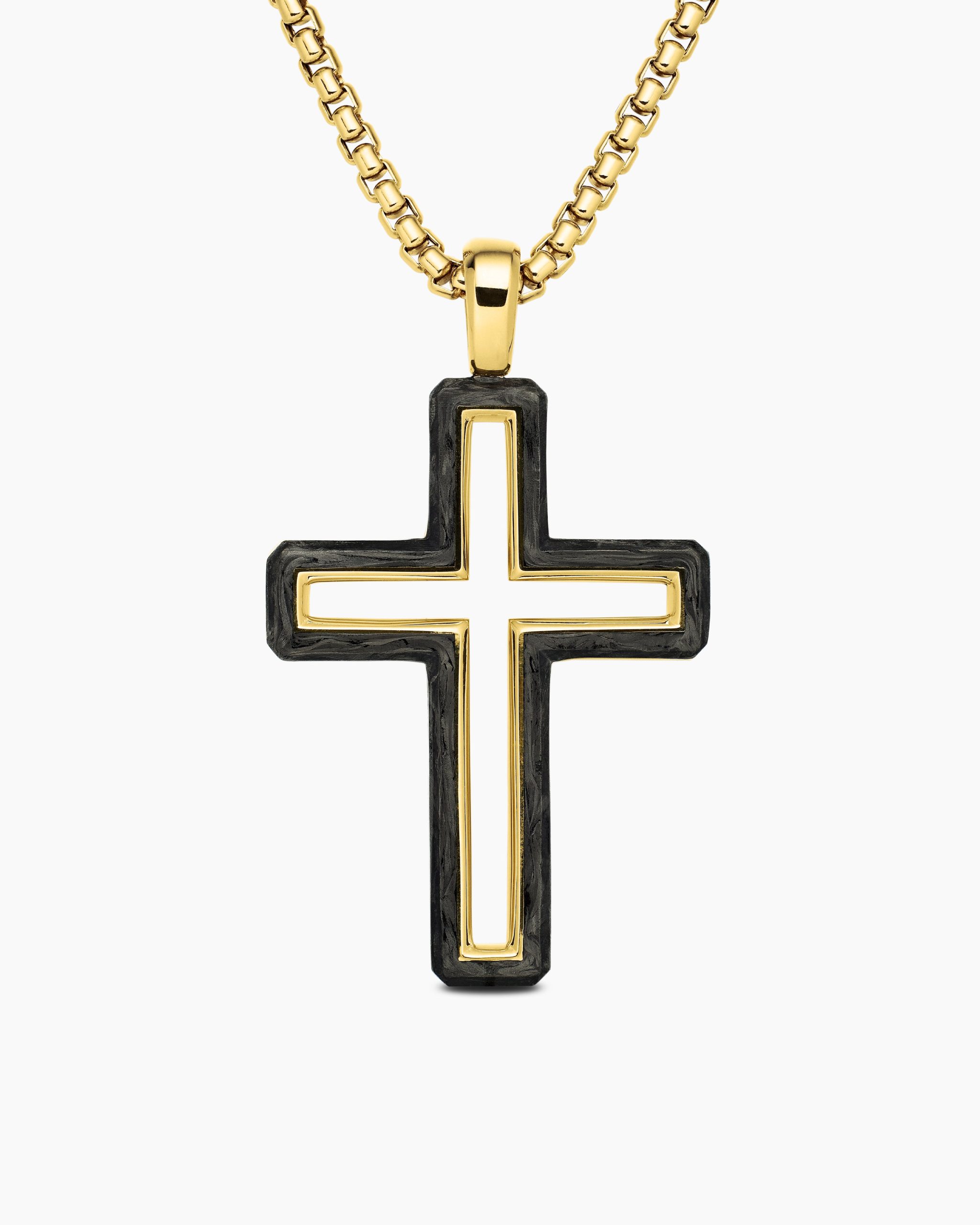 Forged carbon is a lightweight yet strong composite originally used in aeronautics and sports cars. For jewelry, David Yurman pioneered a technique which fuses the modern material and precious metal into innovative, graphic designs. 18-karat yellow goldForged carbonCross, 37 x 27mmPlease note: pendant only; chain sold separatelyShown with: Box Chain