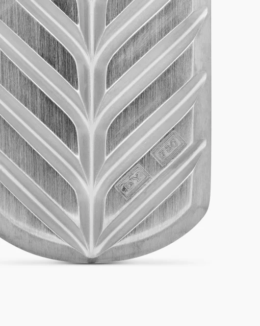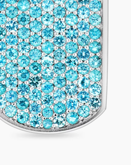 Marked by its double-helix pattern, Chevron is a mirror image of Cable, the house’s signature motif. The ancient V-shaped design offers a sense of modern sophistication, expertly crafted in refined materials, with deep cuts, precise angles, and a play of light and dark to evoke a feeling of forward momentum in the pursuit of excellence. Its elevated look fuses luxury and practicality for everyday wear, imbuing an essence of timelessness and versatility.Inspired by Miami’s magnetic atmosphere, landscapes, and tropical sunsets, vibrant designs feature bold and semi-precious stones in electric pinks, neon greens, cobalt blues, and fiery oranges. These dynamic and radiant pieces embody the excitement and vitality of the city.Visit our Miami Design District flagship and learn more about the store’s dramatic design.Tag only; chain not included. To complete the look, add a box chain.18-karat white goldPavé-set paraiba tourmalines, 3.20 total carat weightTag, 35 x 18.5mmTotal length, 41mm