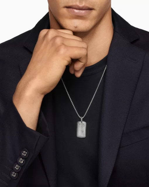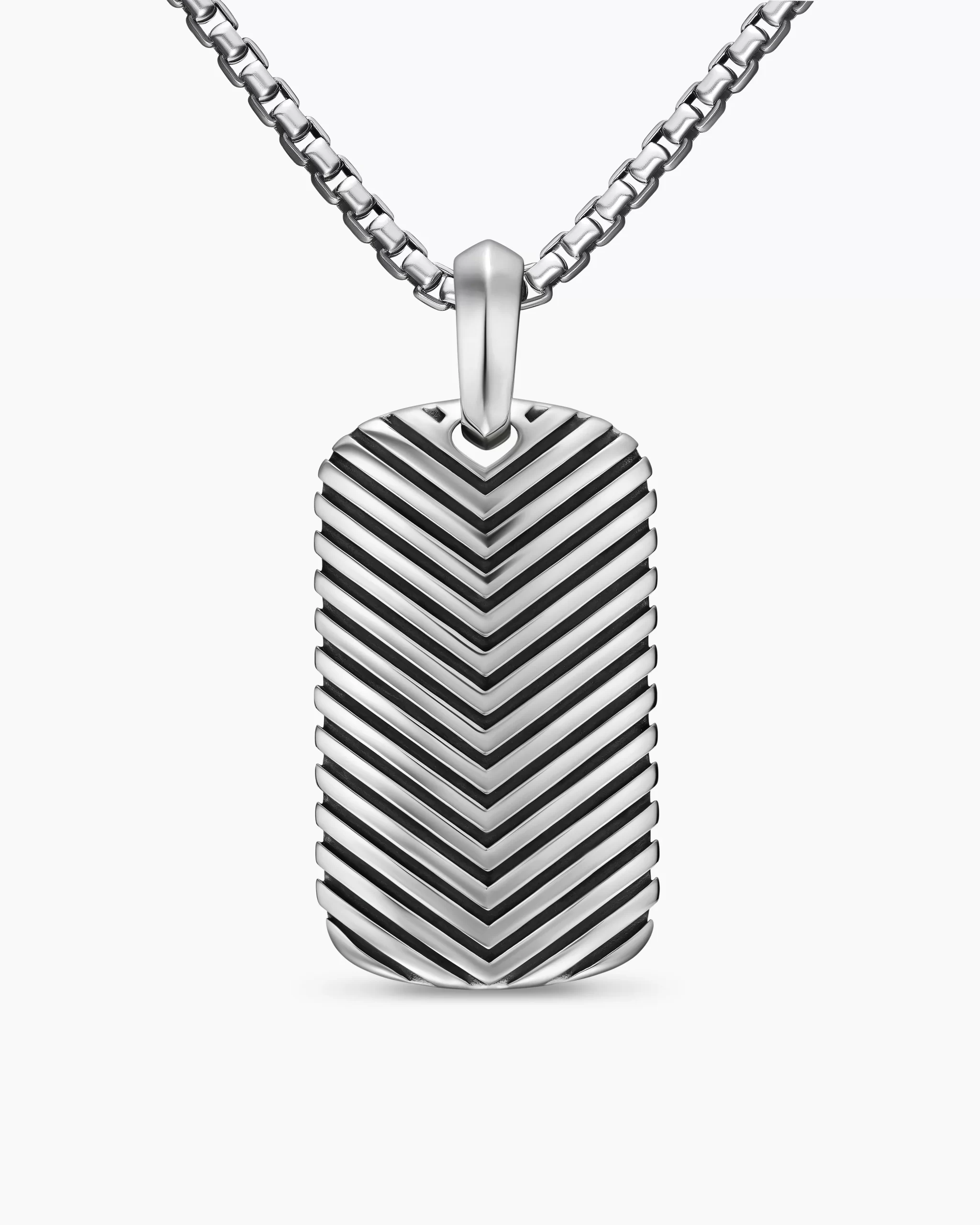 Marked by its double-helix pattern, Chevron is a mirror image of Cable, the house’s signature motif. The ancient V-shaped design offers a sense of modern sophistication, expertly crafted in refined materials, with deep cuts, precise angles, and a play of light and dark to evoke a feeling of forward momentum in the pursuit of excellence. Its elevated look fuses luxury and practicality for everyday wear, imbuing an essence of timelessness and versatility.Tag only; chain not included. To complete the look, add a box chain.Sterling silverTag, 34 x 19.5mmTotal length, 44.8mmThis item can be engraved. Please contact customer care for more information.