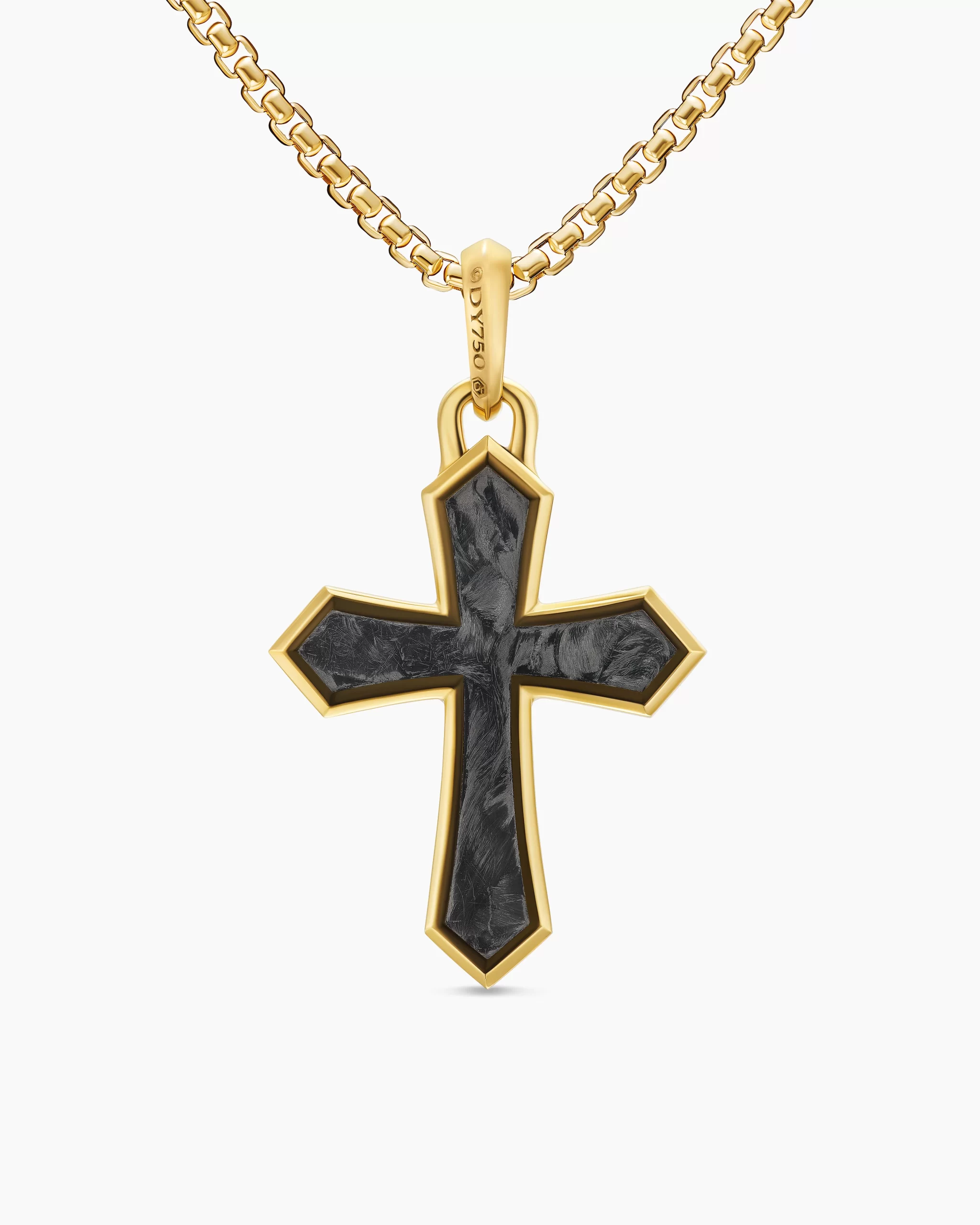 Inspired by clean lines and smooth metal surfaces, these minimalist designs are sculpted with engineered precision.Forged carbon is a lightweight yet strong composite originally used in aeronautics and sports cars. For jewelry, David Yurman pioneered a technique which fuses the modern material and precious metal into innovative, graphic designs.Inspired by clean lines and smooth metal surfaces, these minimalist designs are sculpted with engineered precision.Amulet only; chain not included. To complete the look, add a box chain.18-karat yellow goldForged carbonCross, 28 x 21.7mmTotal length, 37.4mm