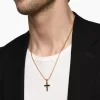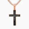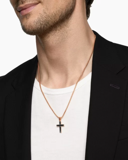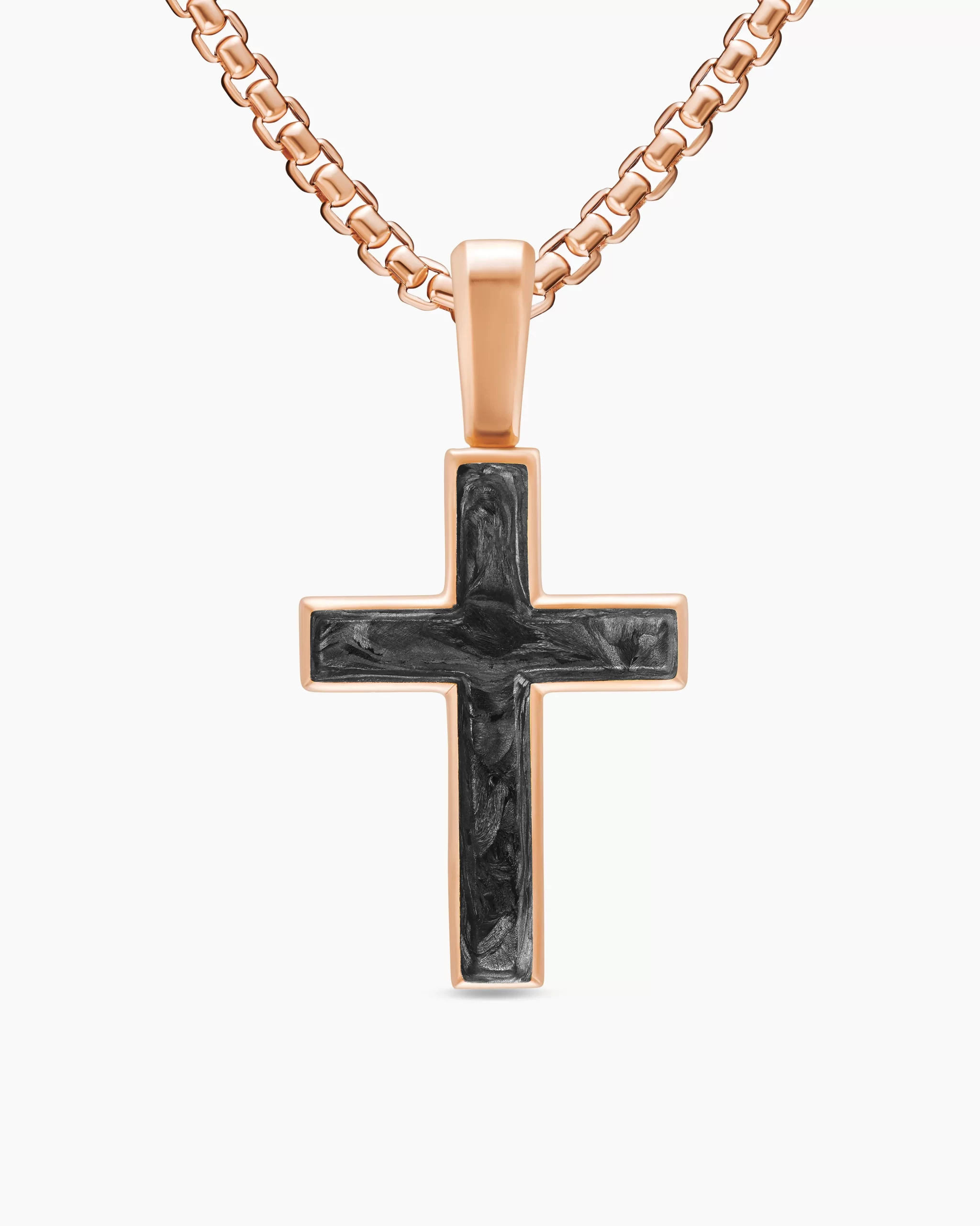 Inspired by clean lines and smooth metal surfaces, these minimalist designs are sculpted with engineered precision.Forged carbon is a lightweight yet strong composite originally used in aeronautics and sports cars. For jewelry, David Yurman pioneered a technique which fuses the modern material and precious metal into innovative, graphic designs.Inspired by clean lines and smooth metal surfaces, these minimalist designs are sculpted with engineered precision.Cross only; chain not included. To complete the look, add a box chain.18-karat rose goldForged carbonCross, 24 x 17mmTotal length, 32.8mm