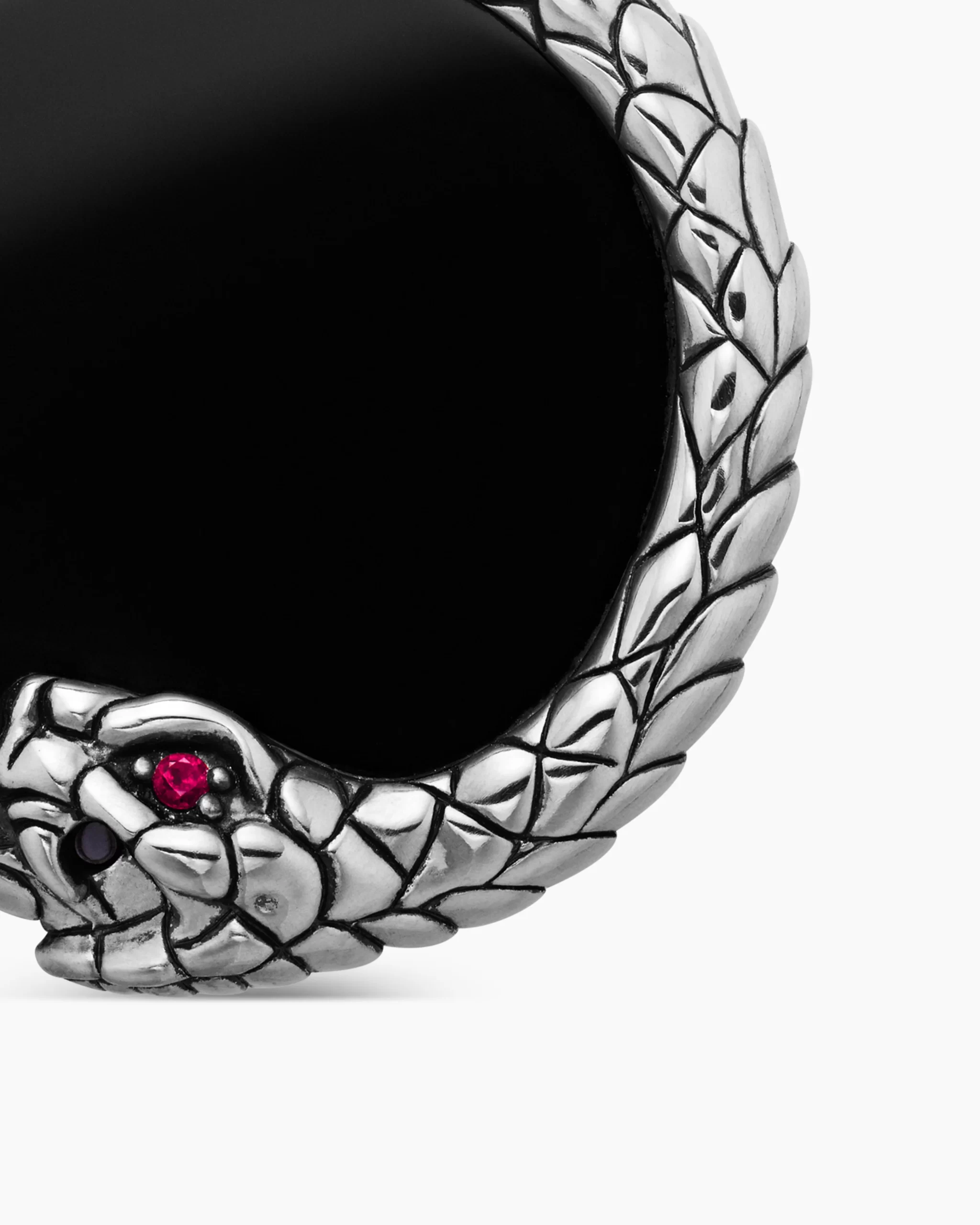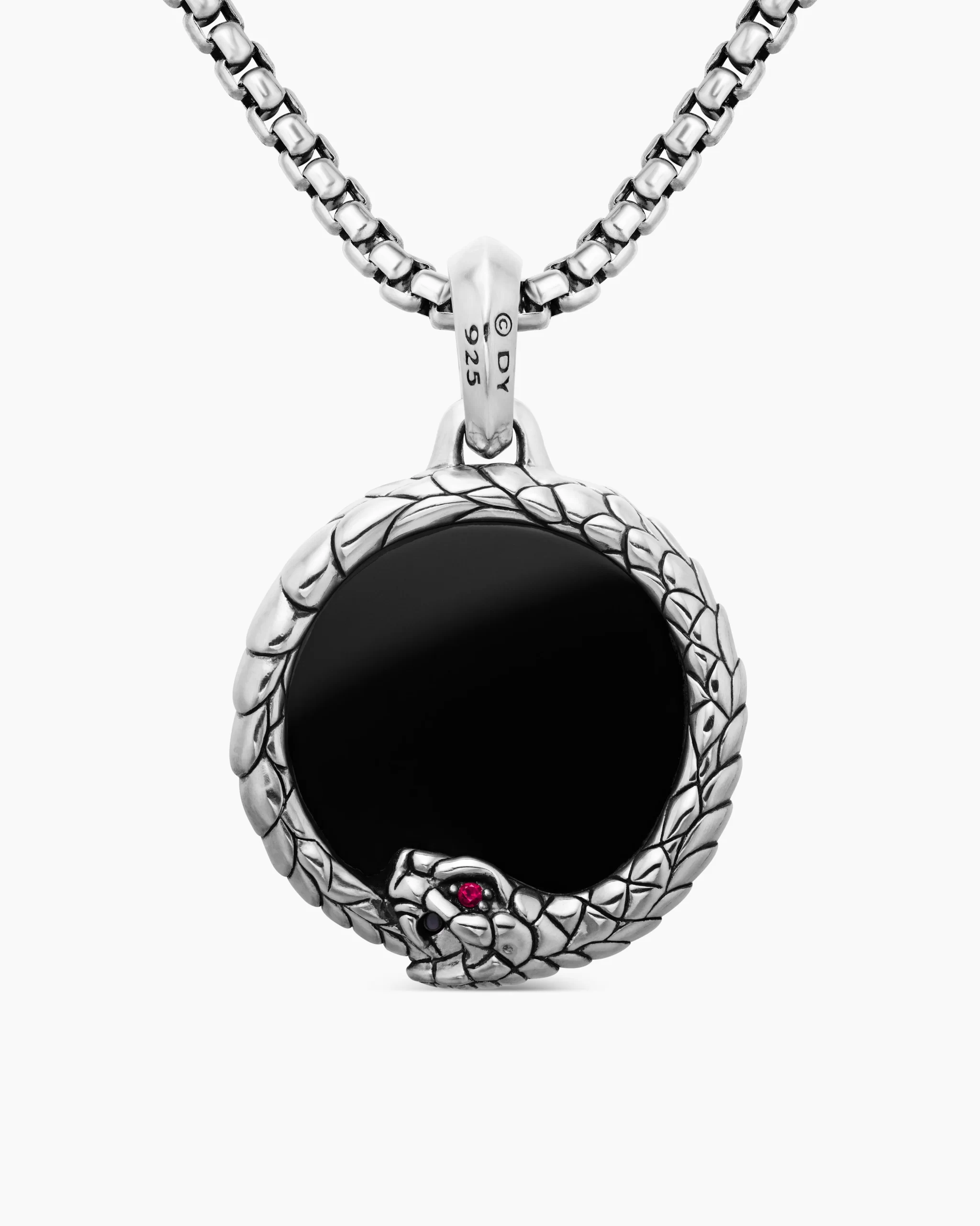 The artistry of ancient Egypt is alive in the Ouroboros Collection, which draws inspiration from the scarab, a traditional symbol of protection. Sterling silverBlack onyxRuby, 0.02 total carat weightAmulet, 25 x 24.7mmTotal length, 36.2mmPlease note: amulet only; chain sold separatelyShown with: Box Chain