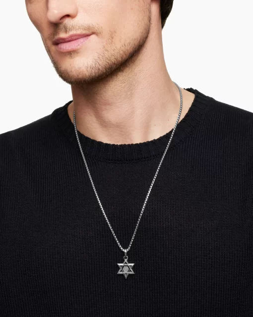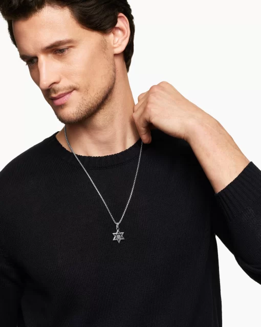 Once linked to spirituality and magic, today’s amulets are expressions of personal style. This collection reflects the modern man’s distinct identities with religious symbols, ancient charms and utilitarian motifs crafted from precious metals and gemstones. Sterling silverAmulet, 34.7 x 19.9mmPlease note: amulet only; chain sold separatelyShown with: Box Chain