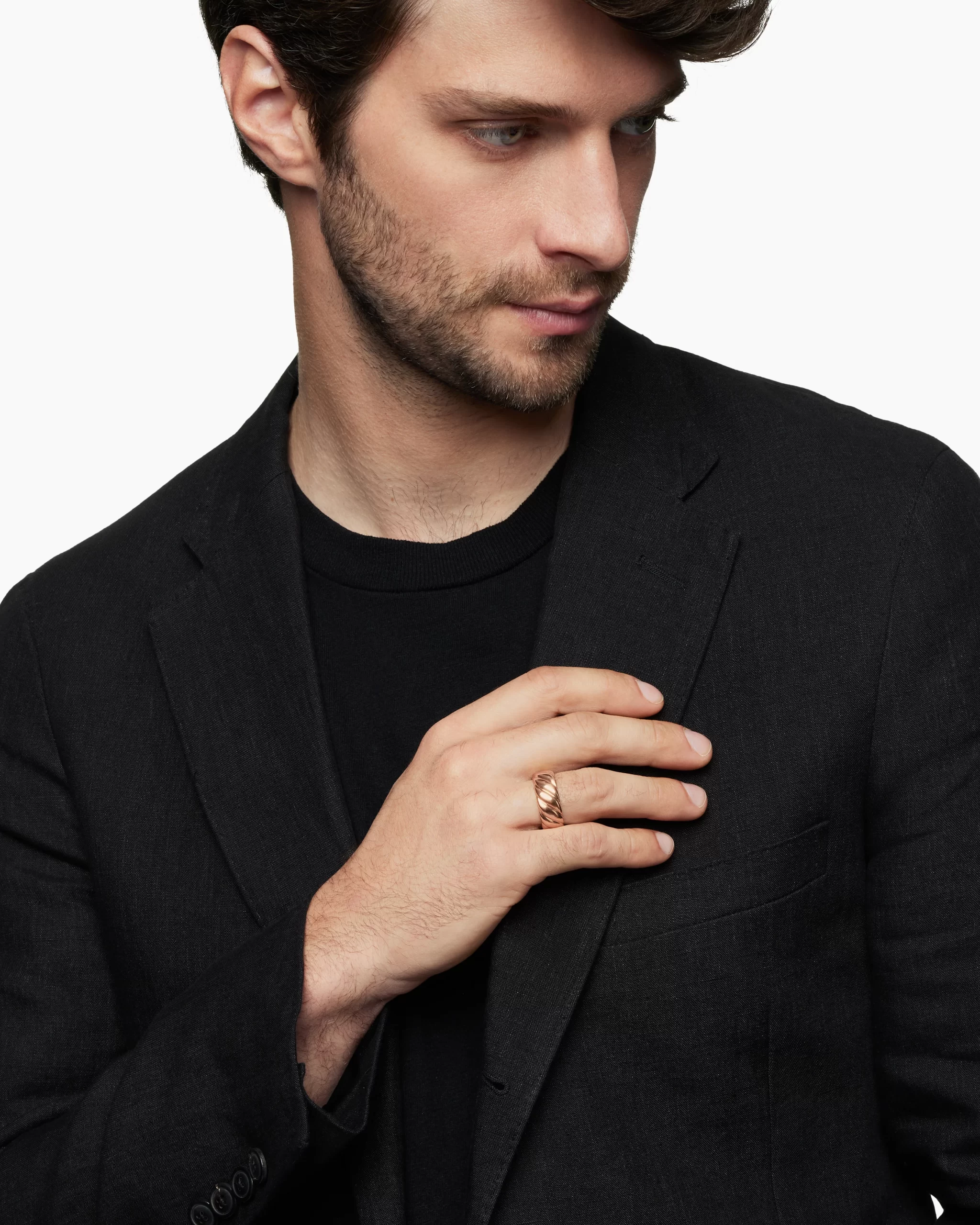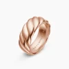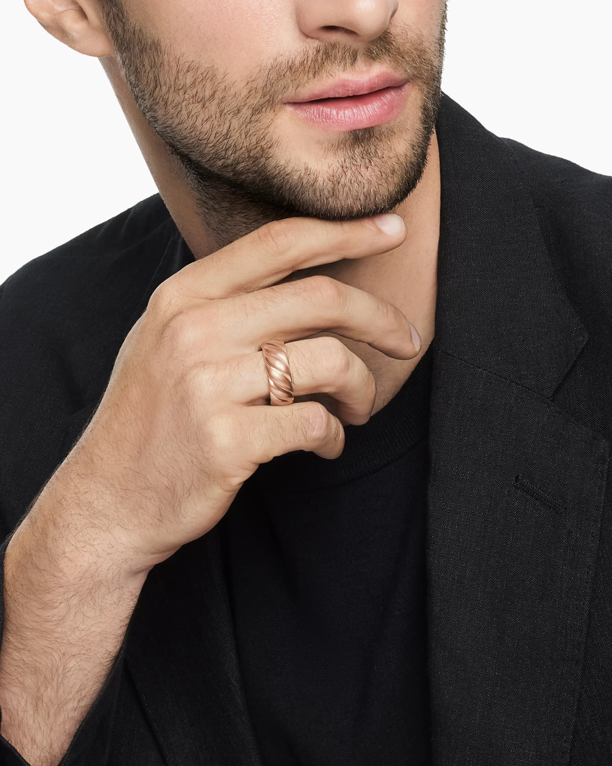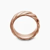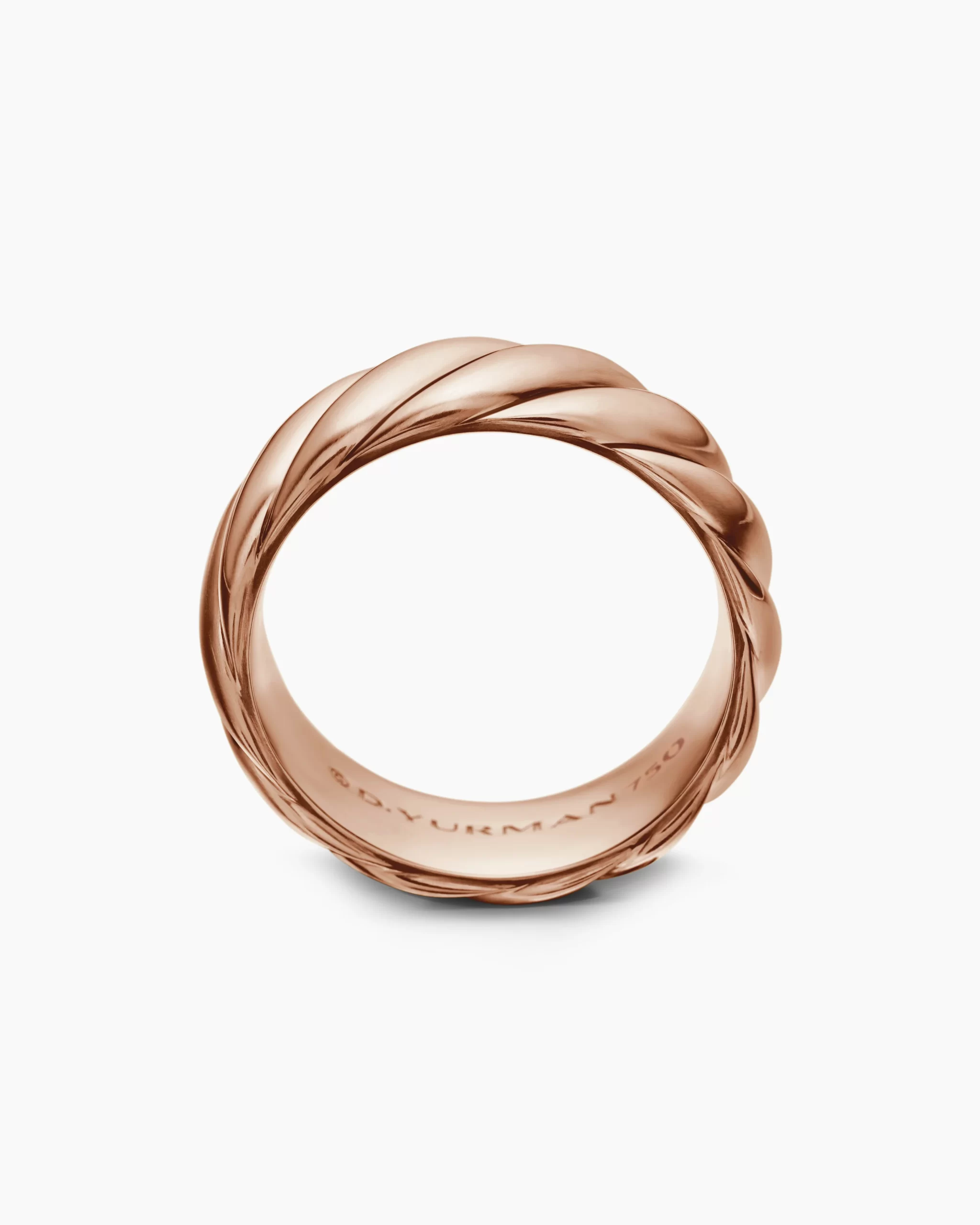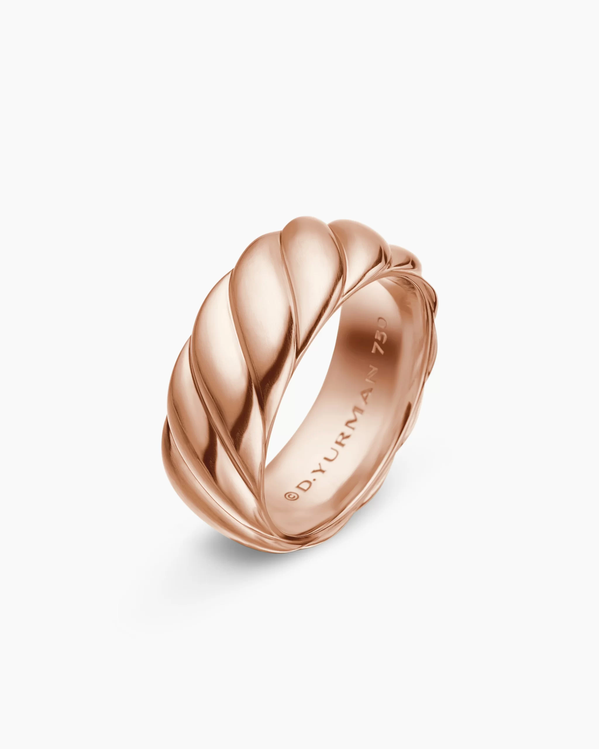 Inspired by his love of architecture and bas-relief sculpture, Evan Yurman designed this modern form by deconstructing Cable—the house’s signature motif—to its essence. Each timeless design is a wearable work of art. Precious metals are meticulously carved with mesmerizing wavelike patterns that dramatically catch the light. Elegant curves highlight the sensuality of the body.18-karat rose goldRing, 9mm