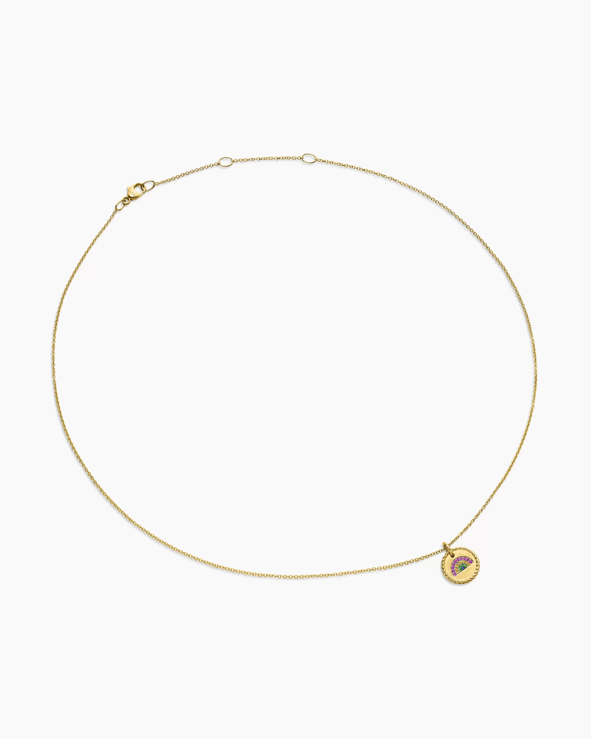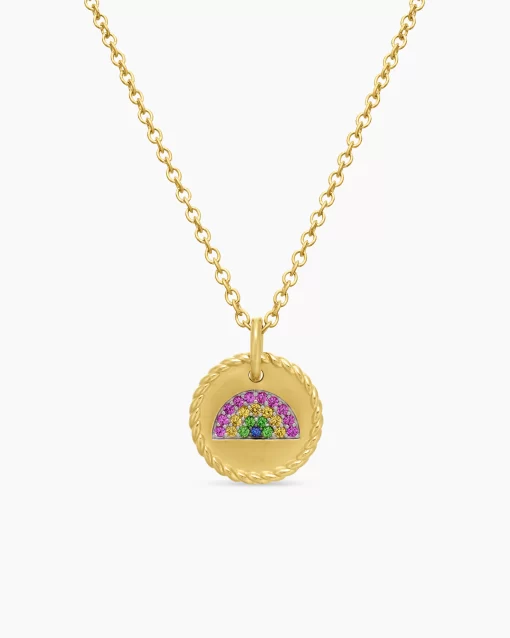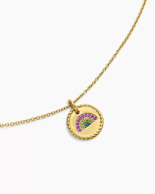 David Yurman’s iconic Cable motif beautifully adorns a universal symbol or shape, creating a modern talisman meant to be collected, combined and treasured. 18-karat yellow goldPink sapphires, yellow sapphires and tsavorites, 0.04 total carat weightAdjustable length, 16-18inCharm, 11mmChain, 1.1mmLobster clasp