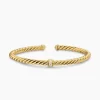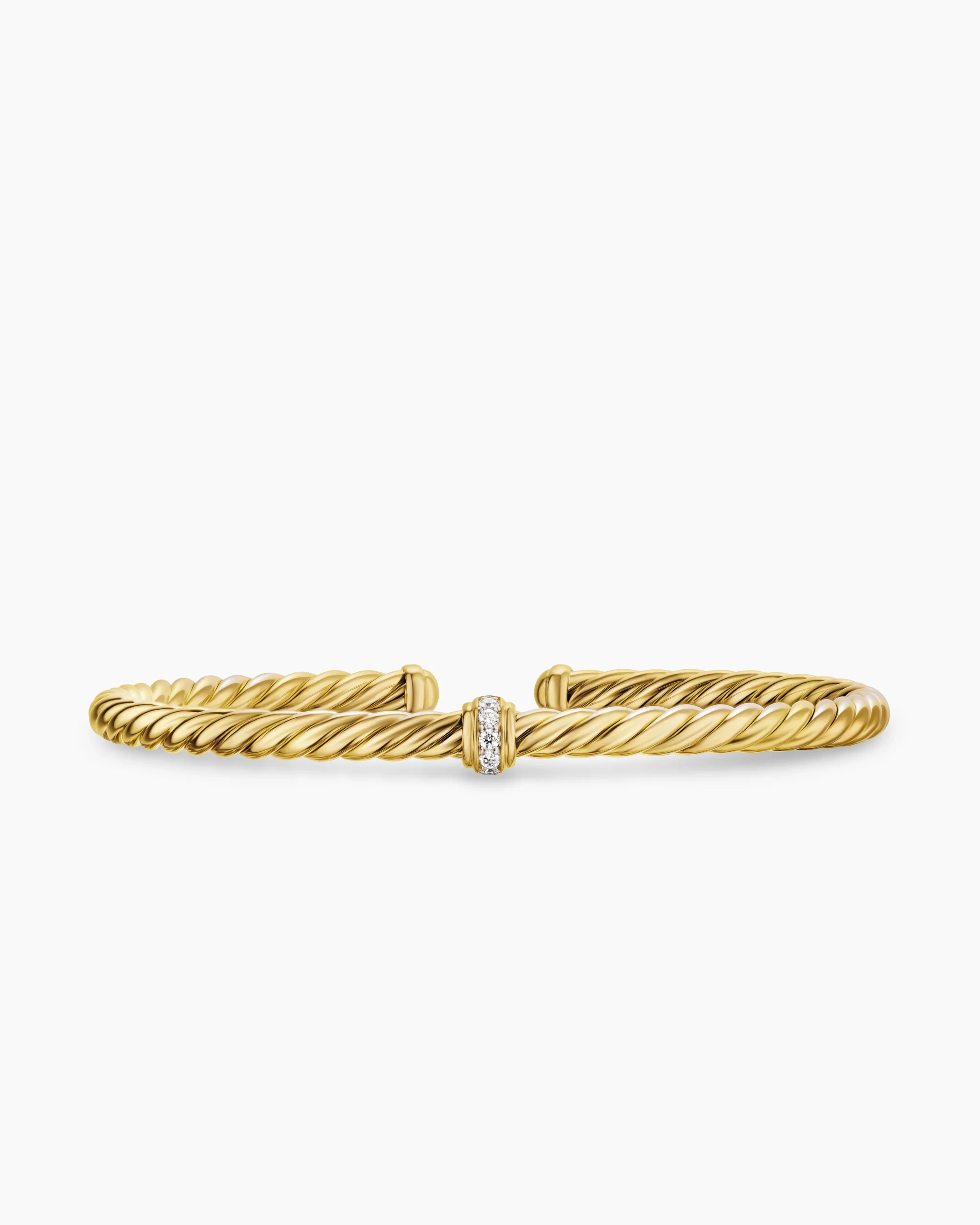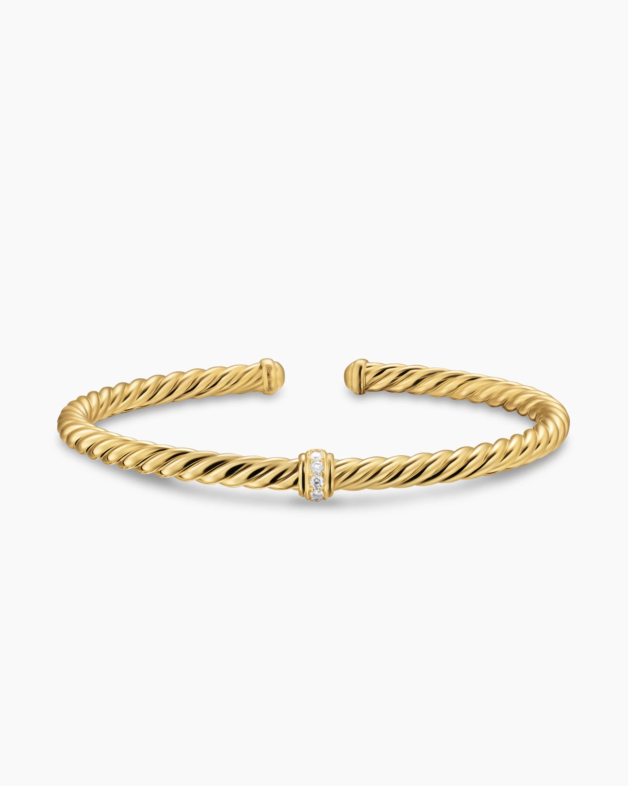 David Yurman’s artistic signature, Cable began as a bracelet that he hand-twisted from 50 feet of wire. For the past 30 years, he has evolved the twisted helix into a myriad of designs. Cablespira® unites artistry and innovation with our exclusive, highly flexible construction.18-karat yellow goldPavé-set diamonds, 0.07 total carat weightBracelet, 4mmCablespira® is a patented DY construction that is highly flexible and exceptionally comfortable to wear.