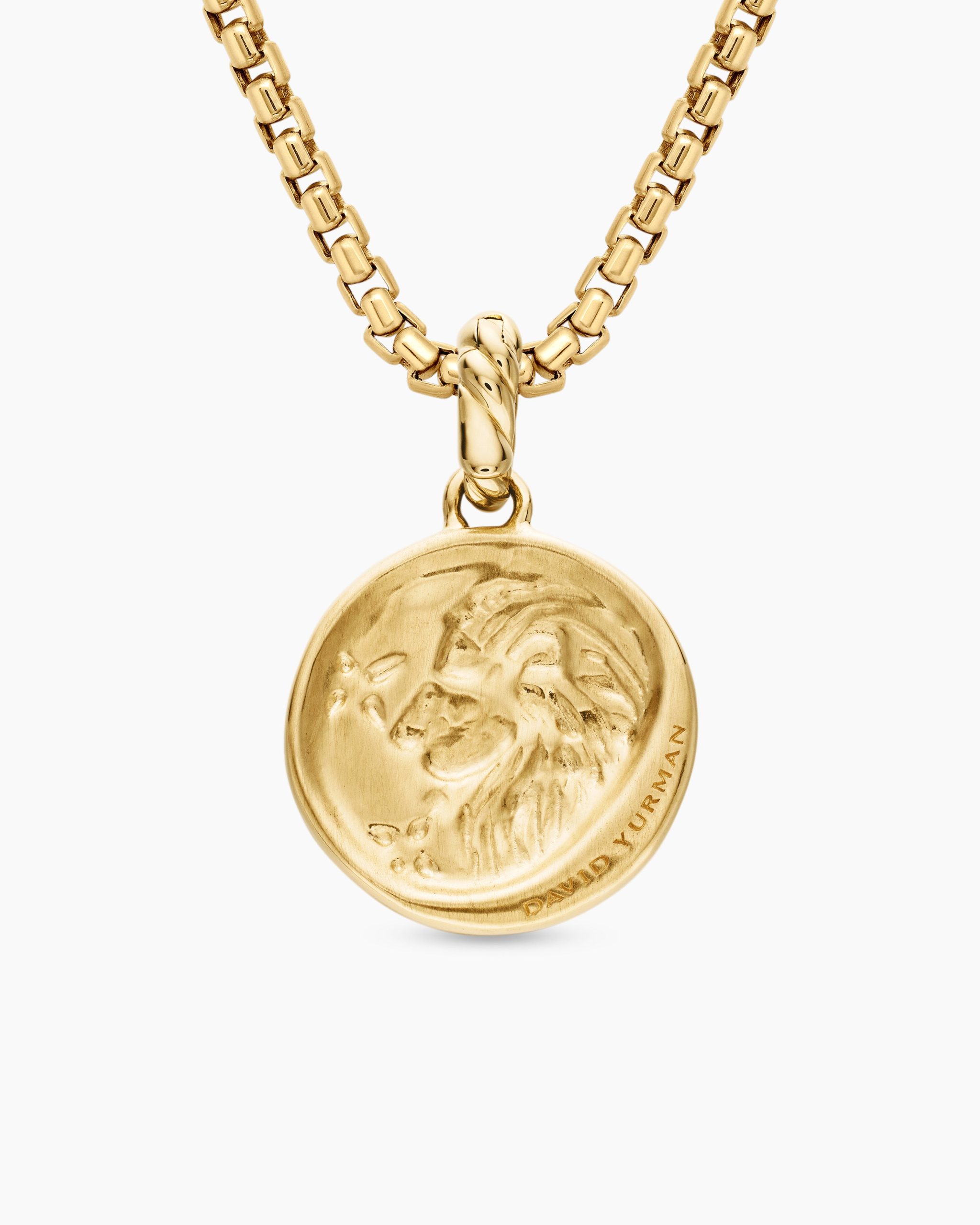 LEOJuly 23–August 22Symbol: LionDetermined, fearless, passionate 18-karat yellow gold Diamonds, 0.04 total carat weightAmulet, 28.7 x 18.8mmFunctioning bail allows pendant to attach to a necklace or bracelet.Please note: amulet only; chain sold separately.Shown with: Box Chain