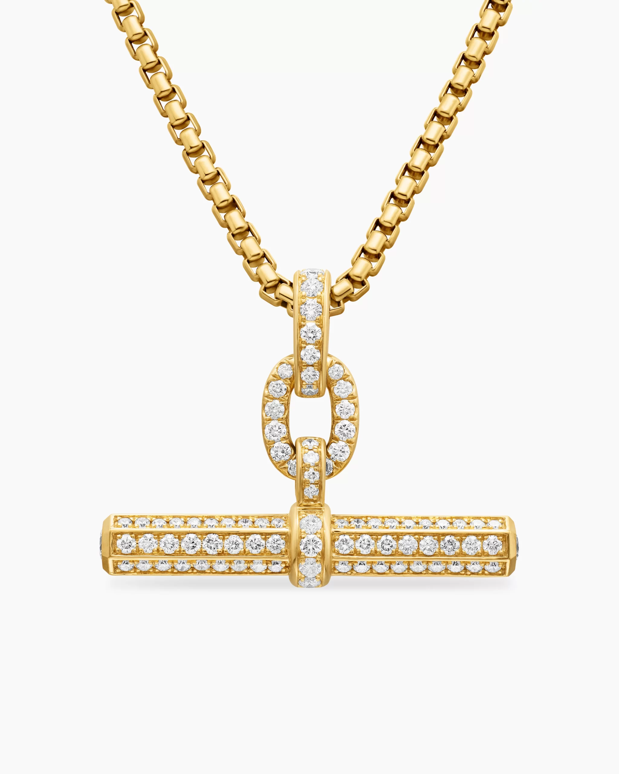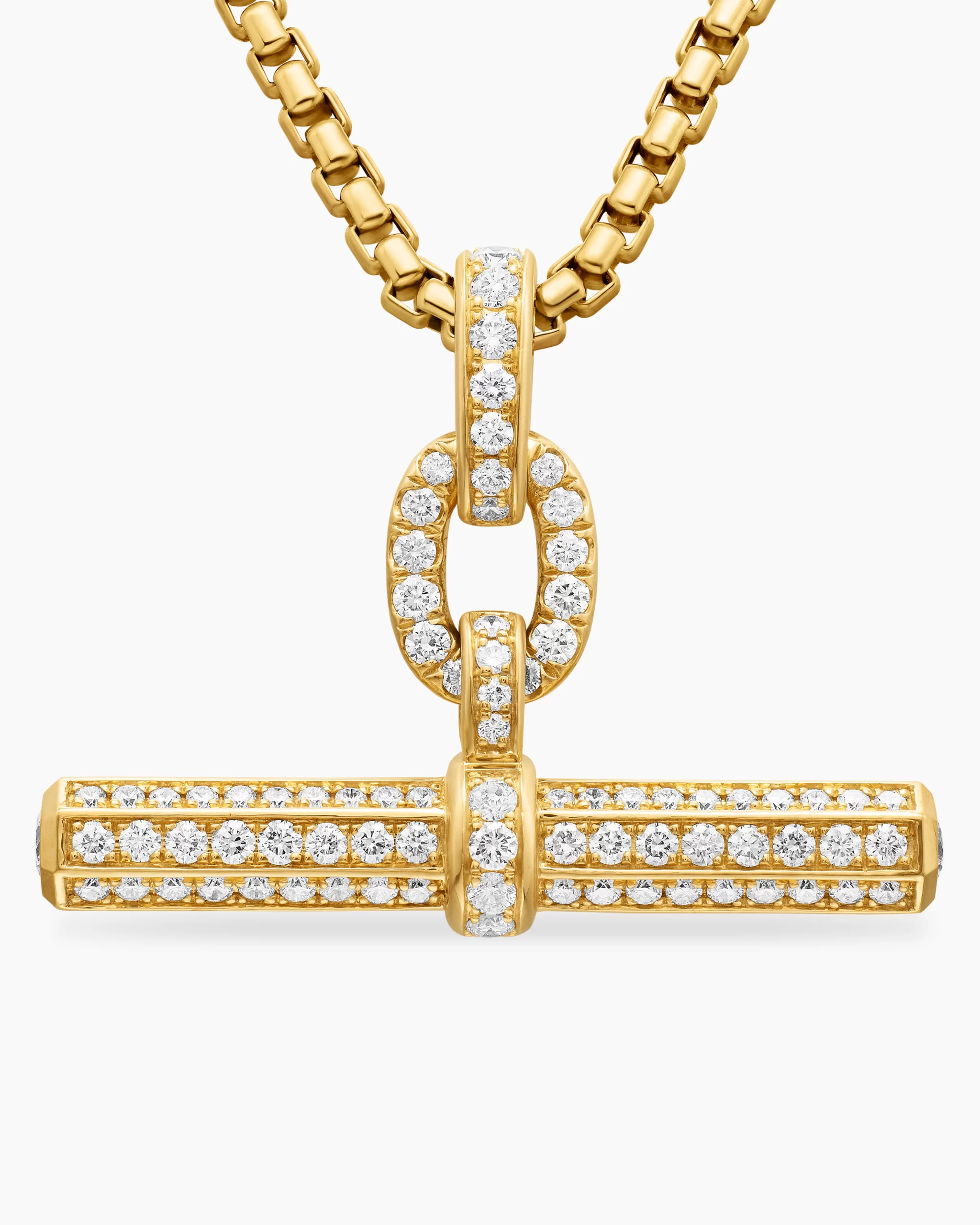 This Lexington design is inspired by the sleek sensibility of ‘30s Manhattan architecture, with clean lines and the juxtaposition of smooth and Cabled metal. 18-karat yellow gold Pavé diamonds, 1.51 total carat weightPendant, 36 x 28mmFunctioning bail allows pendant to attach to a necklace or bracelet.Please note: pendant only; chain sold separatelyShown with: Box ChainThis item can be engraved. Please contact customer care for more information.