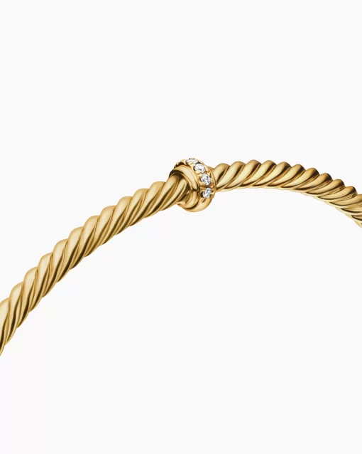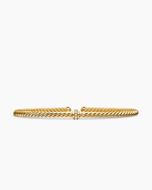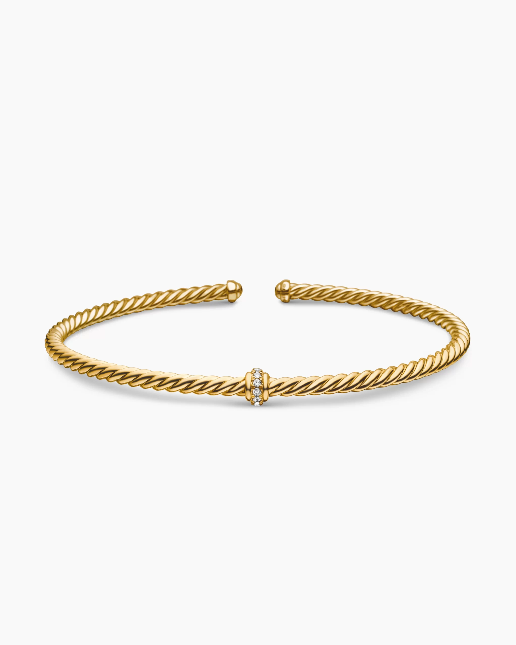 David Yurman’s artistic signature, Cable began as a bracelet that he hand-twisted from 50 feet of wire. For the past 30 years, he has evolved the twisted helix into a myriad of designs. Cablespira® unites artistry and innovation with our exclusive, highly flexible. construction. 18-karat yellow goldPavé diamonds, 0.04 total carat weightBracelet, 3mmCablespira® is a patented DY construction that is highly flexible and exceptionally comfortable to wear.