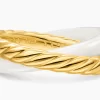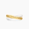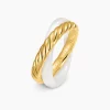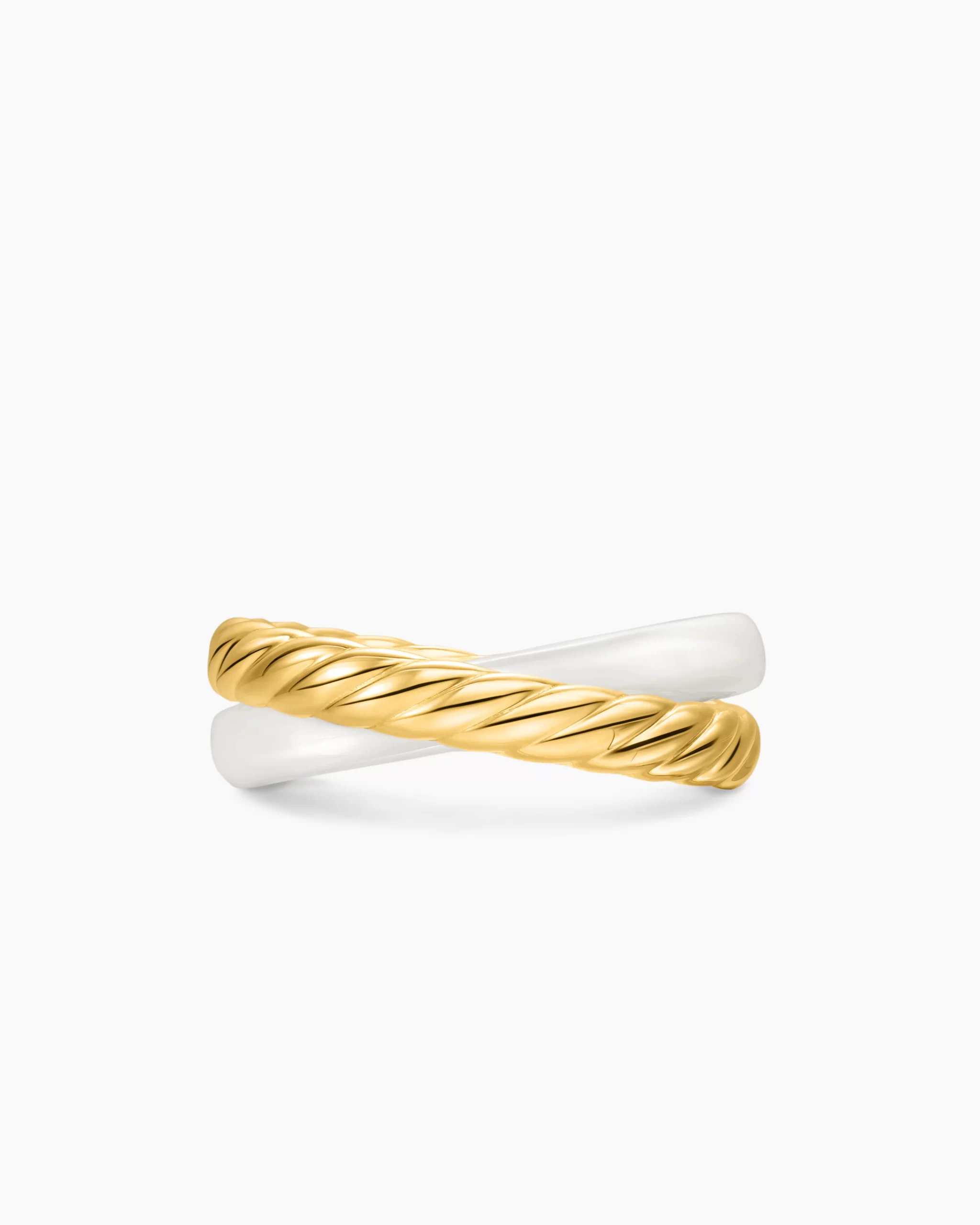 The DY Crossover® Collection explores the rhythmic weaving of line to create form and movement. Using a dynamic range of smooth and cabled cords, the individual strands are meticulously entwined.18-karat yellow goldWhite ceramicRing, 7mmStrands of smooth and Cabled metals intertwine with a dynamic rolling effect, creating a rhythmic weaving of form and movement.