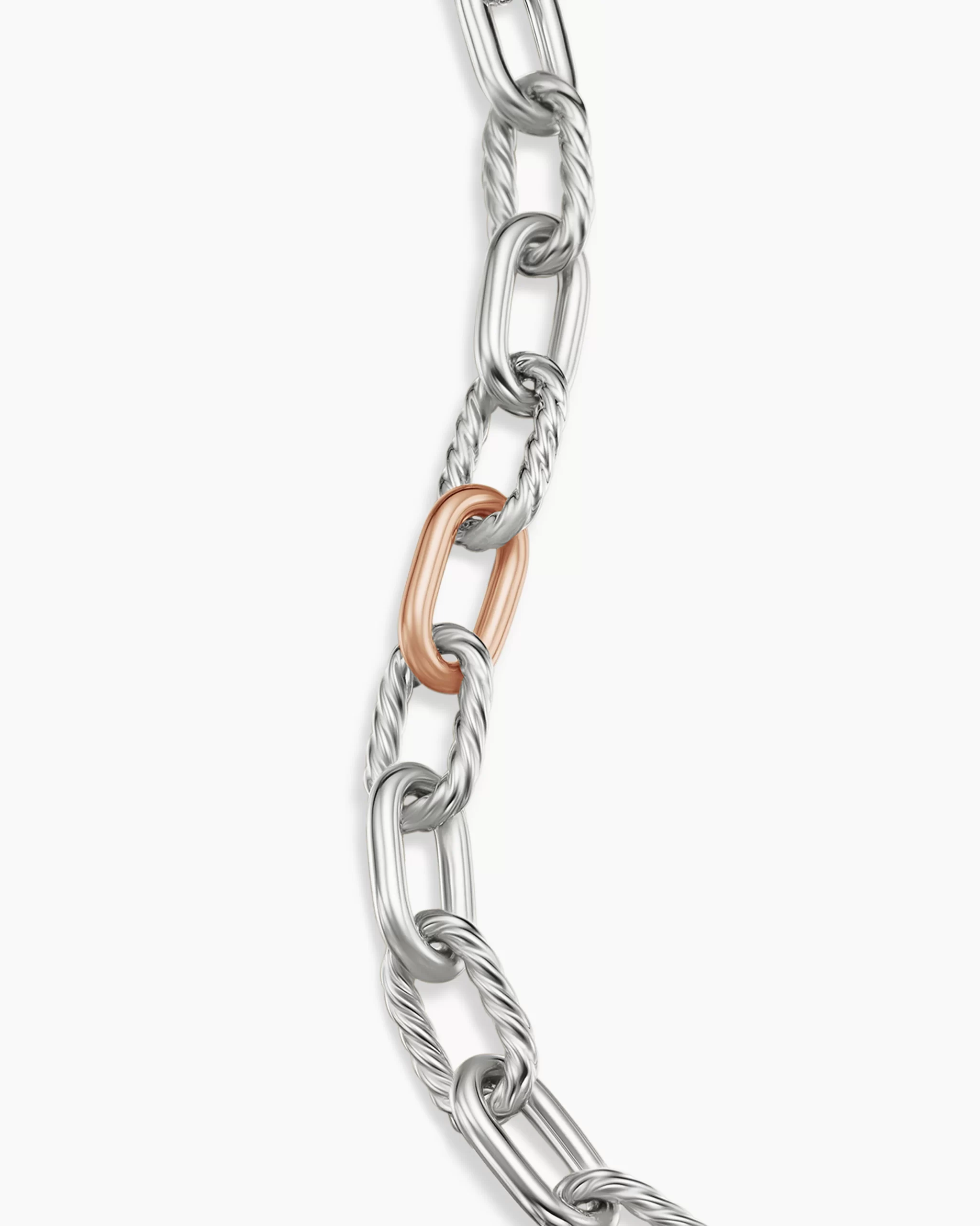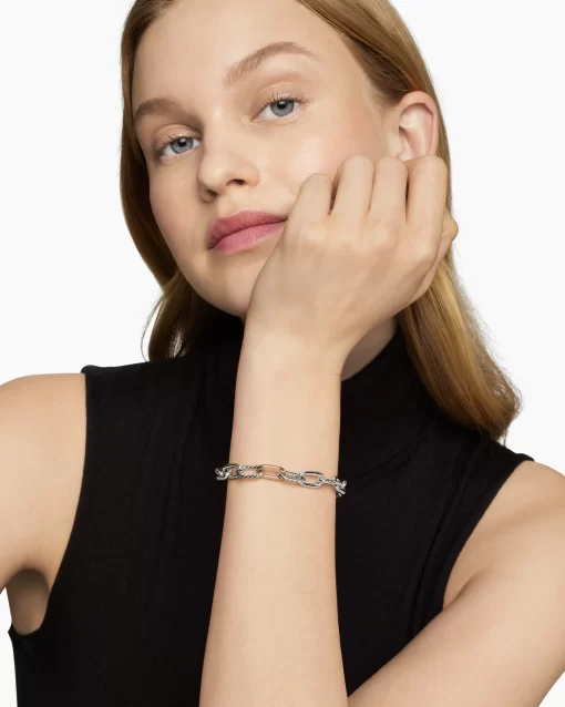 Named for the iconic Manhattan avenue, DY Madison® captures the bold spirit of New York City—unexpected moments and the promise of success. A striking juxtaposition of smooth and Cabled, pillow-shaped links fuses the brand’s signature design elements to create a unique rhythm. At once modern and timeless, these must-have chains are instant heirlooms.Sterling silver with bonded 18-karat bonded rose goldBracelet, 8.5mmPush clasp