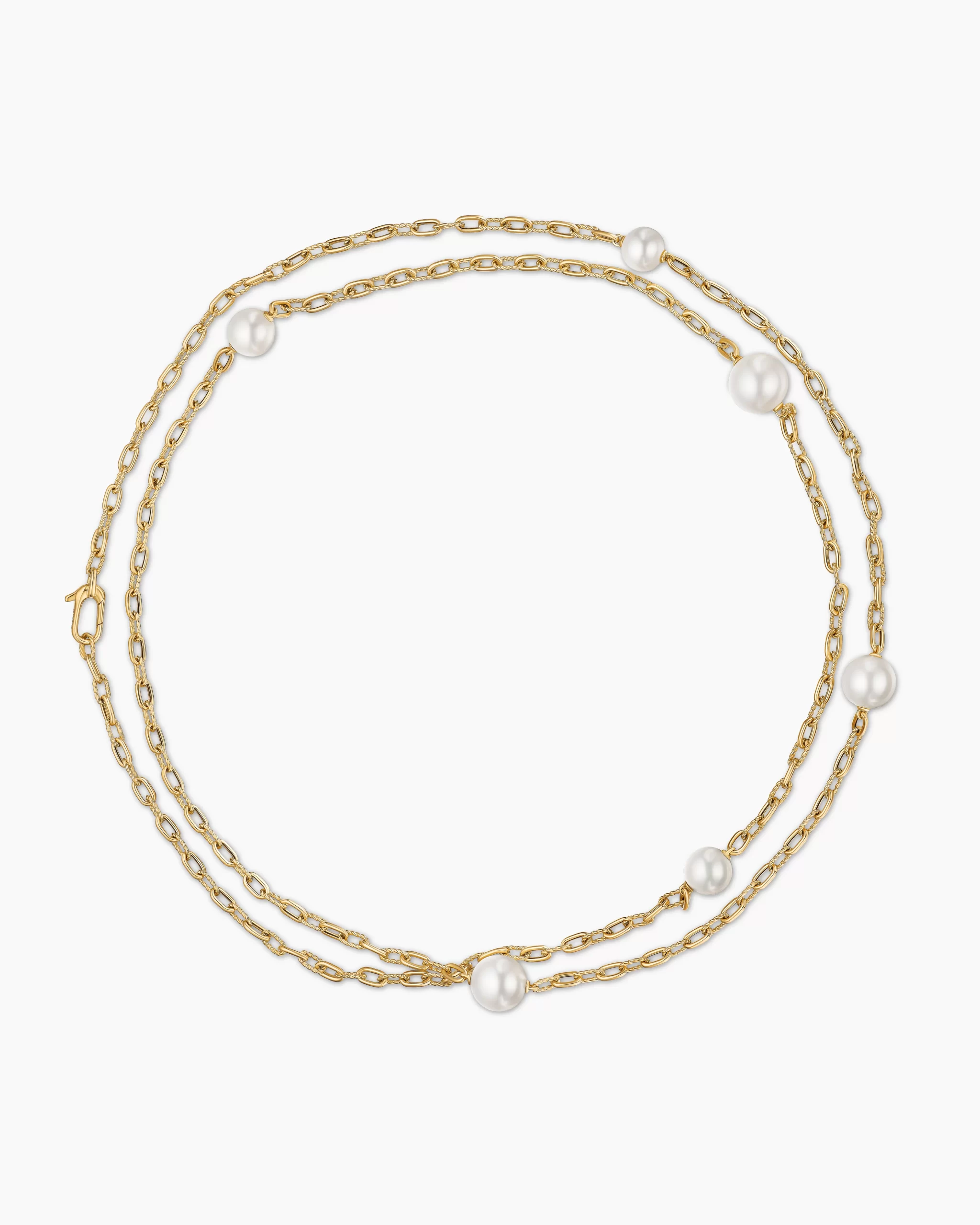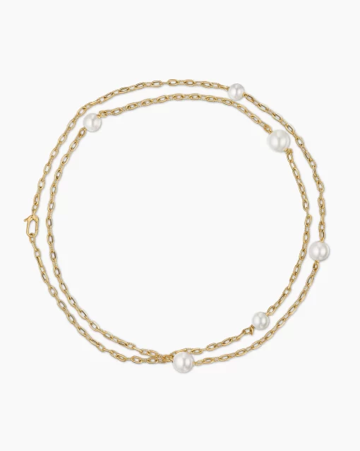 The DY Madison® Collection offers an elegant take on the classic chain, enhanced by the luster and beauty of pearls. 18-karat yellow goldCultured freshwater pearl, 8-11mmChain, 6.2mmPush clasp