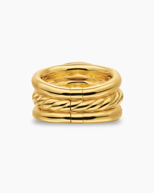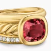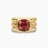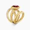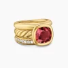 Inspired by SoHo’s historic art scene and galleries, DY Mercer® captures bold creativity and the spirit of New York. The collection channels a youthful energy with exaggerated oval links, unique toggle closures, and stacked silhouettes. Crafted in 18K gold and sterling silver with antique cushion-cut gems, these sculptural designs combine elevated artistry with an effortlessly modern feel.18-karat yellow goldRhodolite garnet, 4.70 total carat weightStone, 10mmPavé-set diamonds, total carat weight ranges from 0.38 to 0.47 (dependent on size)Ring, 12mm