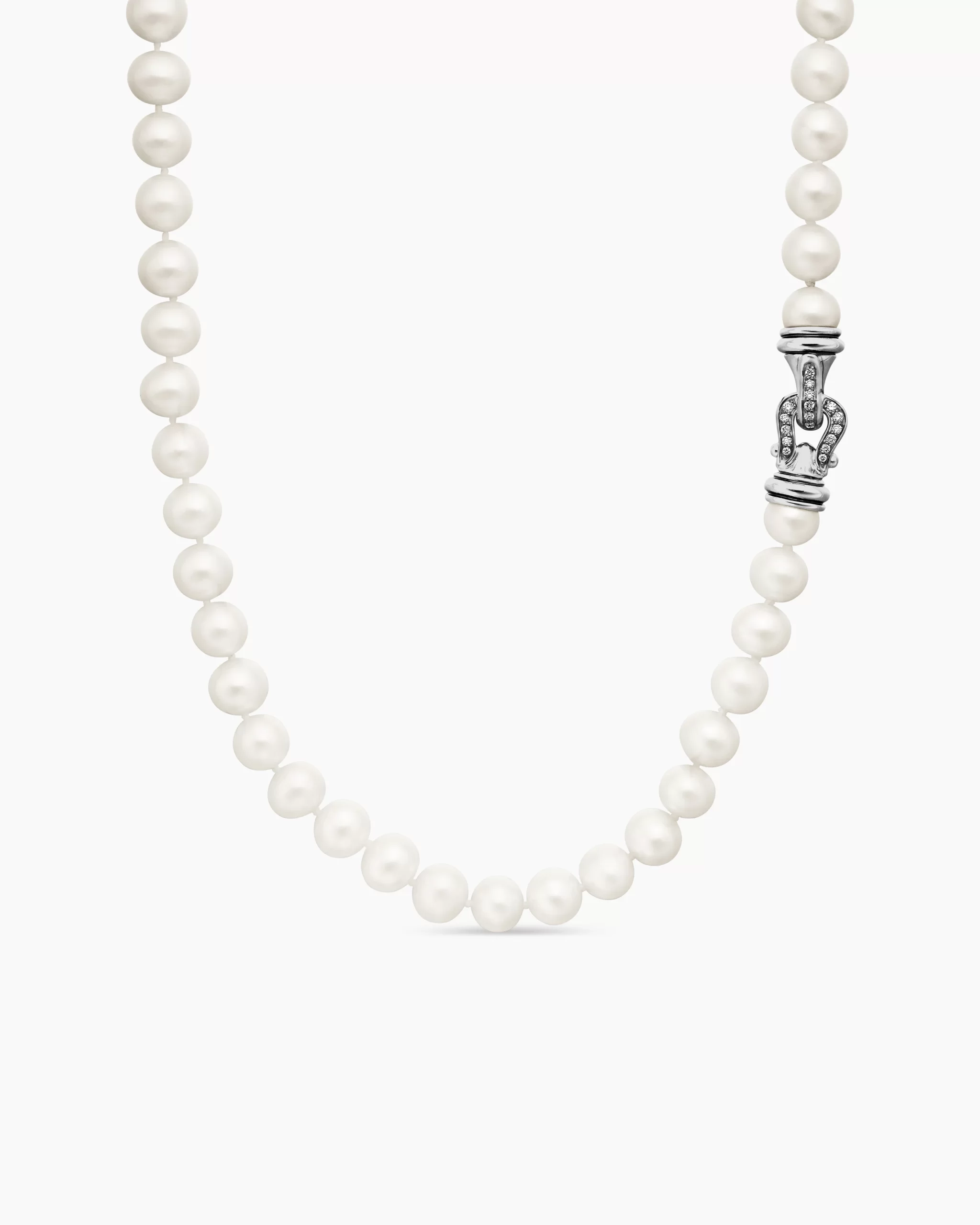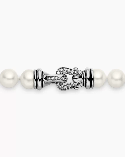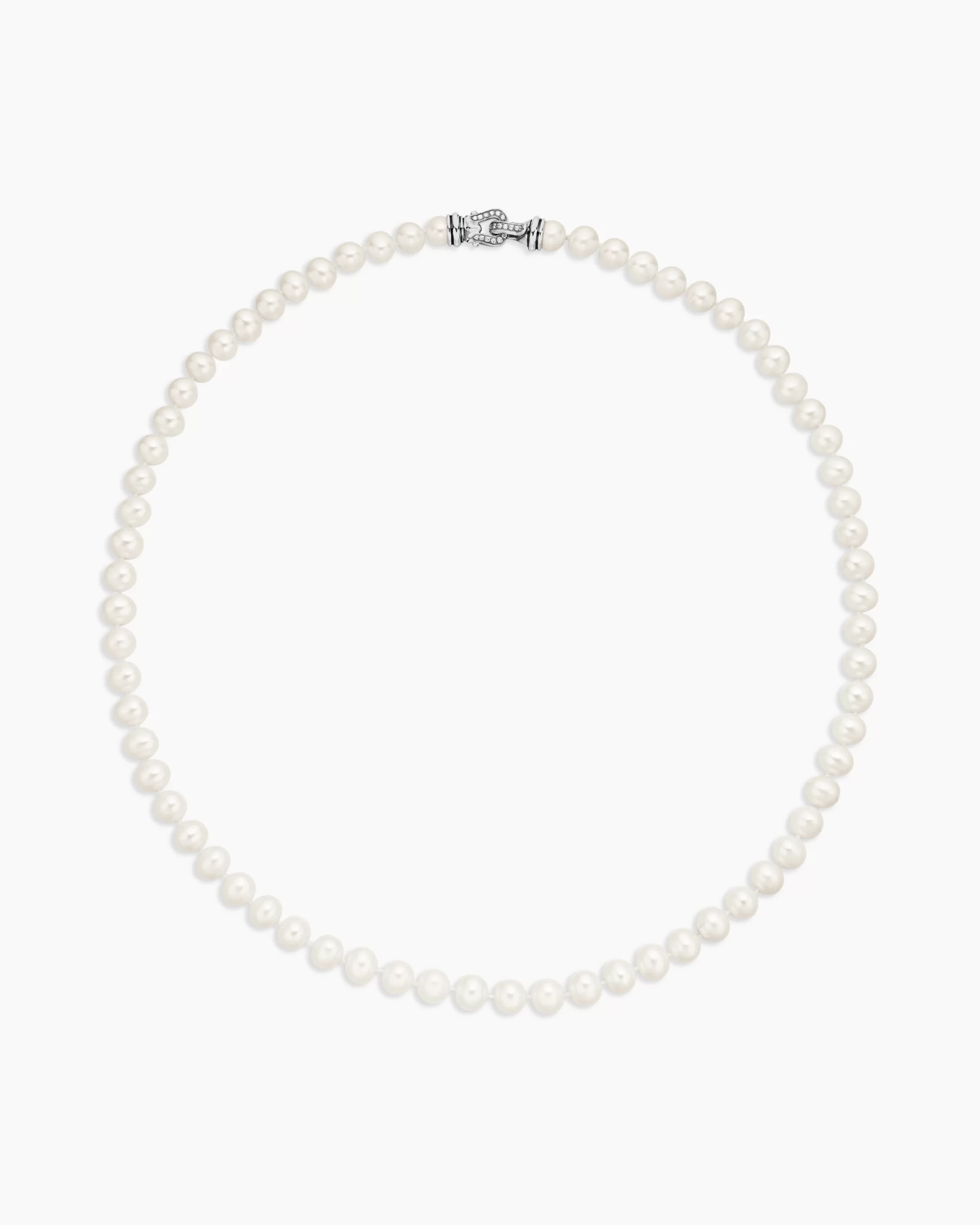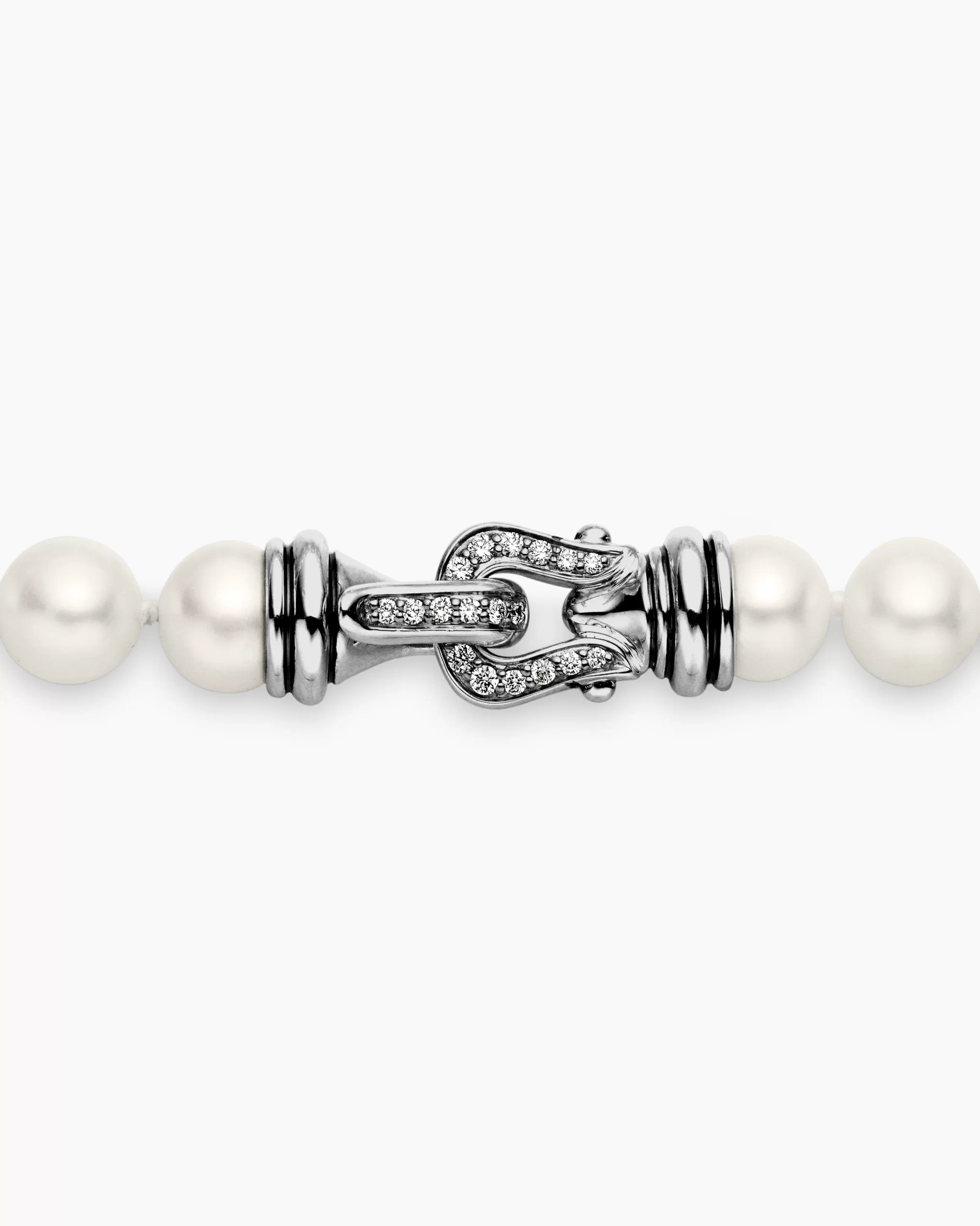 Gifts from nature, the lustrous beauty of pearls has always inspired our timeless designs. Sterling silverCultured freshwater pearls, 8-8.5mmPavé diamonds, 0.38 total carat weightHinged hook clasp