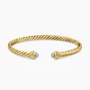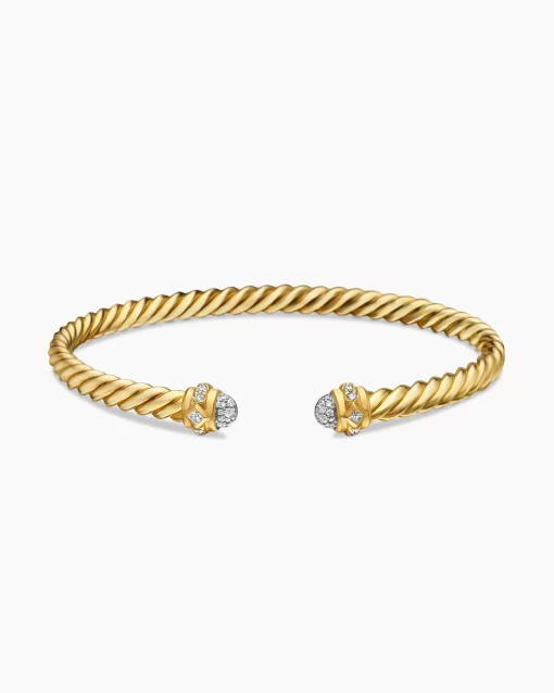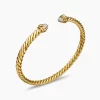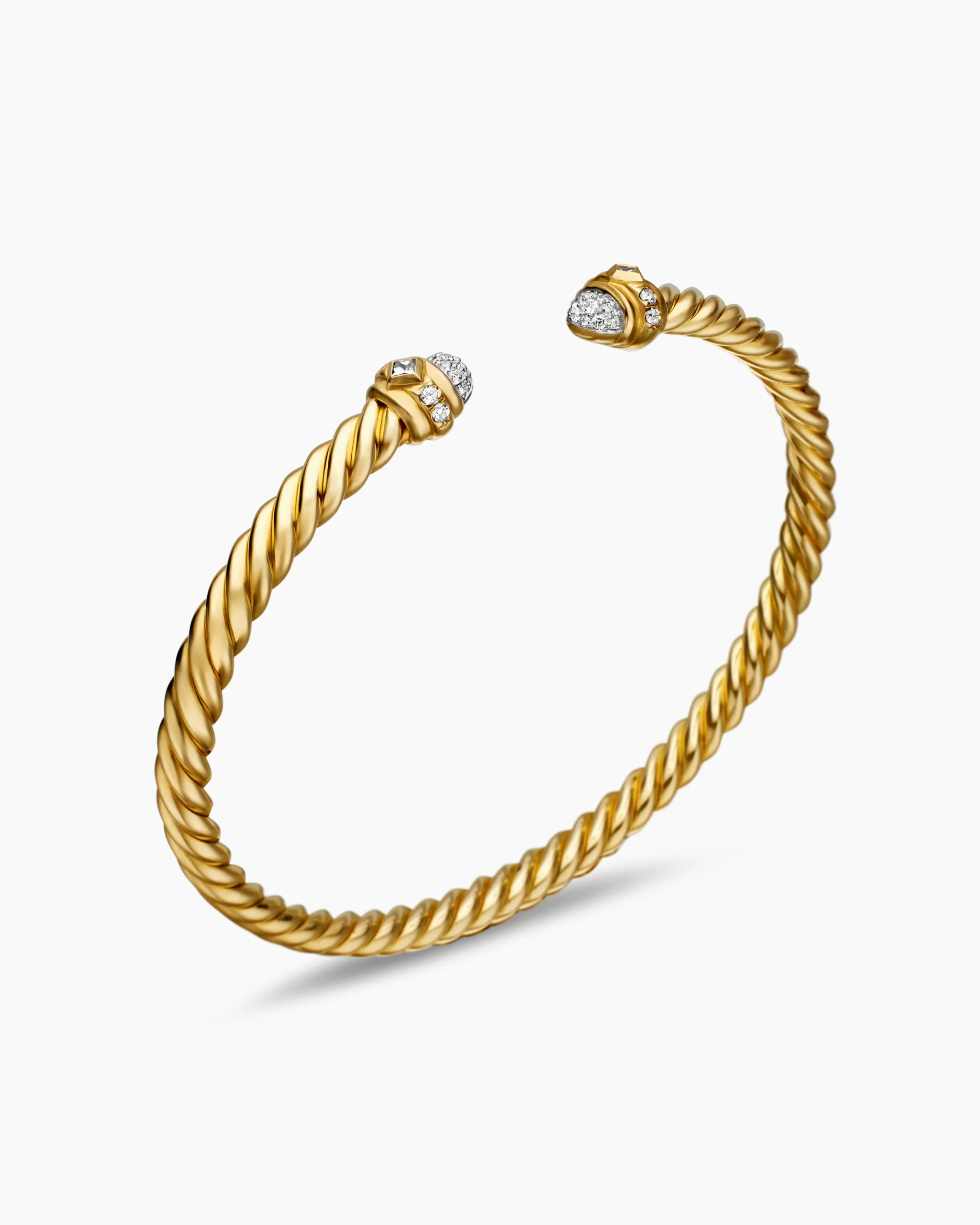 David Yurman’s artistic signature, Cable began as a bracelet that he hand-twisted from 50 feet of wire. For the past 30 years, he has evolved the twisted helix into a myriad of designs. Cablespira® unites artistry and innovation with our exclusive, highly flexible. construction. 18-karat yellow goldPavé diamonds, 0.25 total carat weightBracelet, 4.5mmCablespira® is a patented DY construction that is highly flexible and exceptionally comfortable to wear.