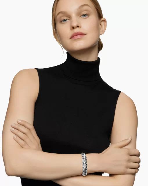 Inspired by his love of architecture and bas-relief sculpture, Evan Yurman designed this modern form by deconstructing Cable—the house’s signature motif—to its essence. Each timeless design is a wearable work of art. Precious metals are meticulously carved with mesmerizing wavelike patterns that dramatically catch the light. Elegant curves highlight the sensuality of the body.Sterling silverBracelet, 14mmBox clasp