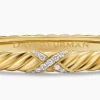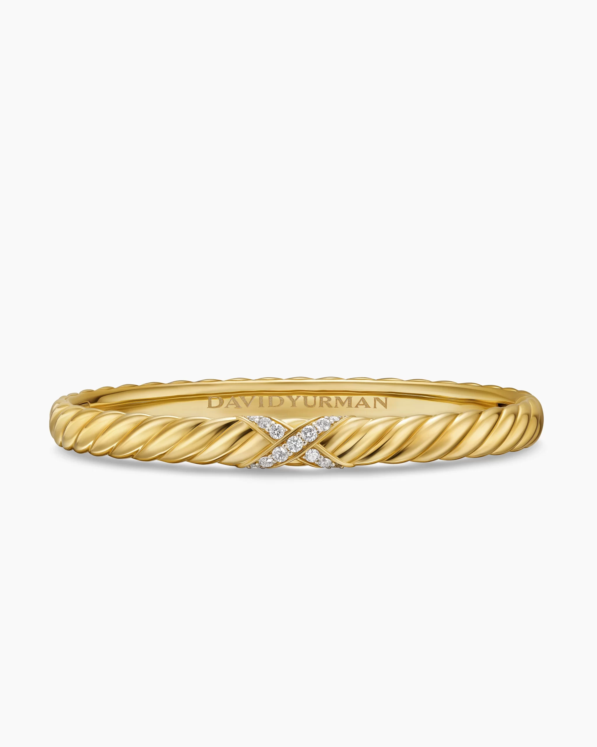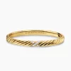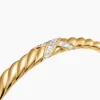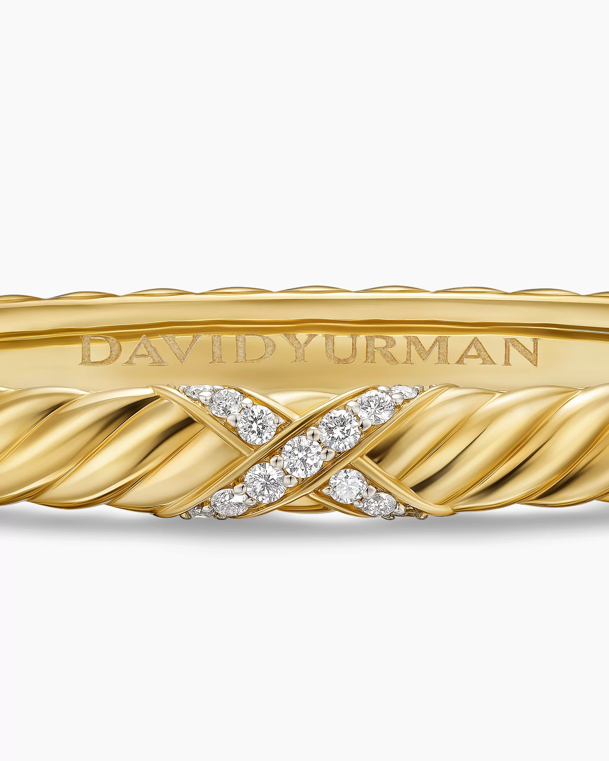 Inspired by his love of architecture and bas-relief sculpture, Evan Yurman designed this modern form by deconstructing Cable—the house’s signature motif—to its essence. Each design is a wearable work of art; precious metals are meticulously carved with exquisite wavelike patterns that dramatically catch the light. Elegant curves highlight the sensuality of the body, with pavé-set diamonds for a statement of added brilliance.18-karat yellow goldPavé-set diamonds, 0.29 total carat weightBracelet, 6.2mmHinge clasp