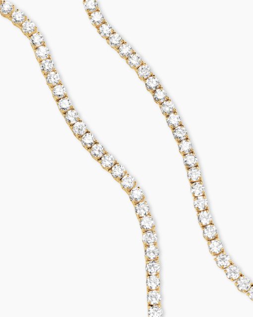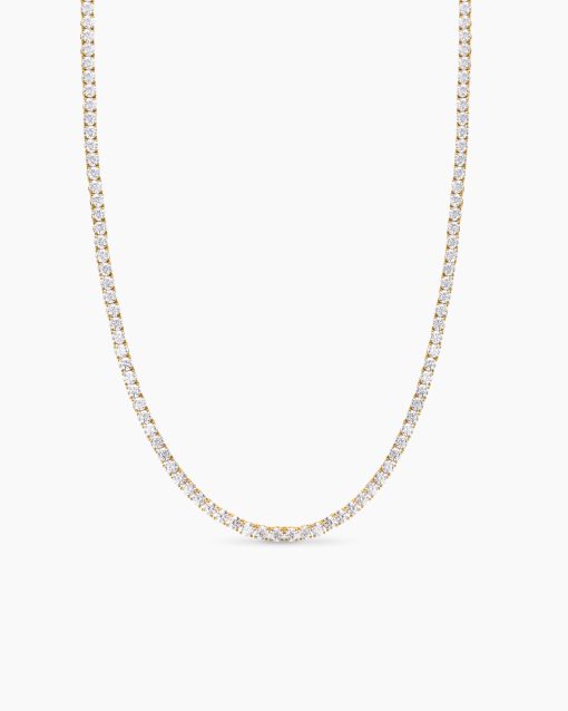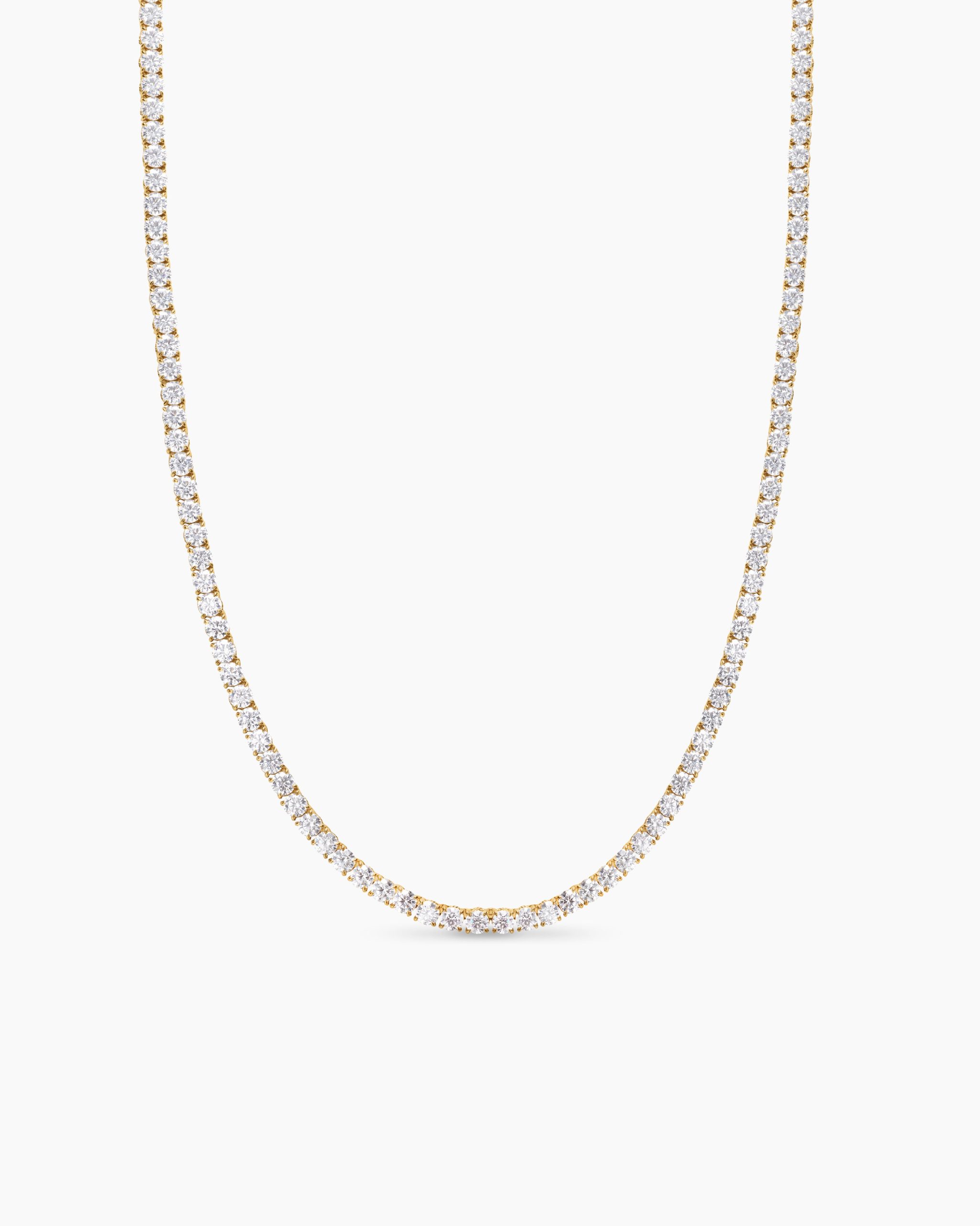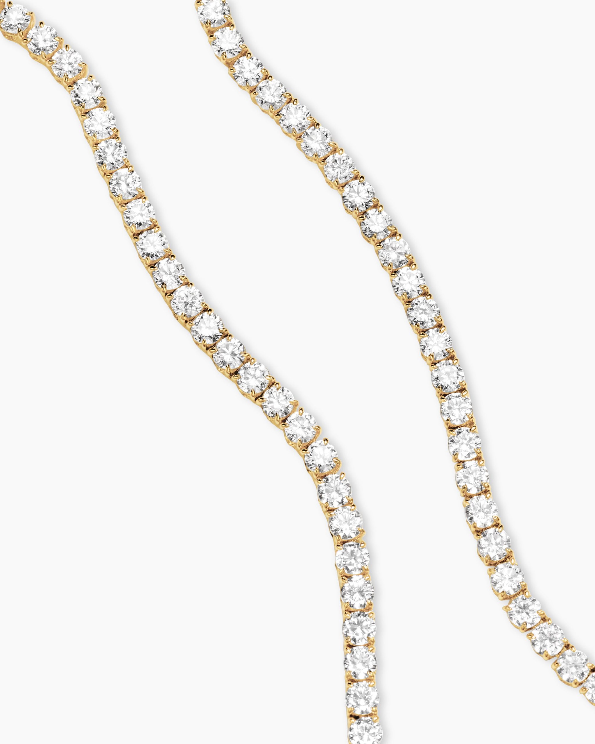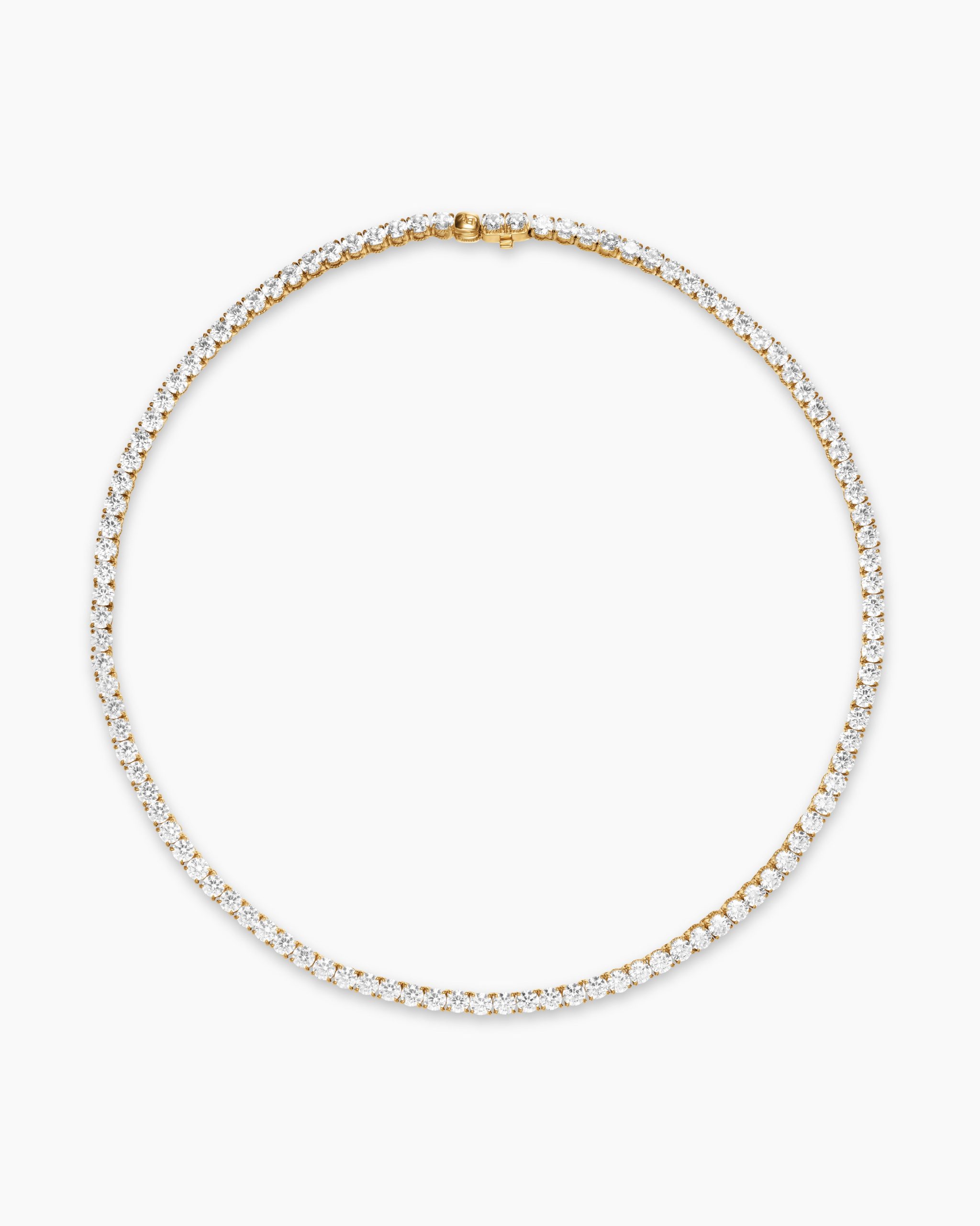 Ever since Chris Evert’s diamond bracelet flew off her wrist at the 1978 US Open, this style has been known as a “tennis bracelet”—a continuous line of bezel or prong-set diamonds. Now expanded to include necklaces, our elegant new additions come in both 18K yellow and white gold with hand-set stones.18-karat yellow goldProng-set diamonds, 26.25 total carat weight Necklace, 4mmPush clasp